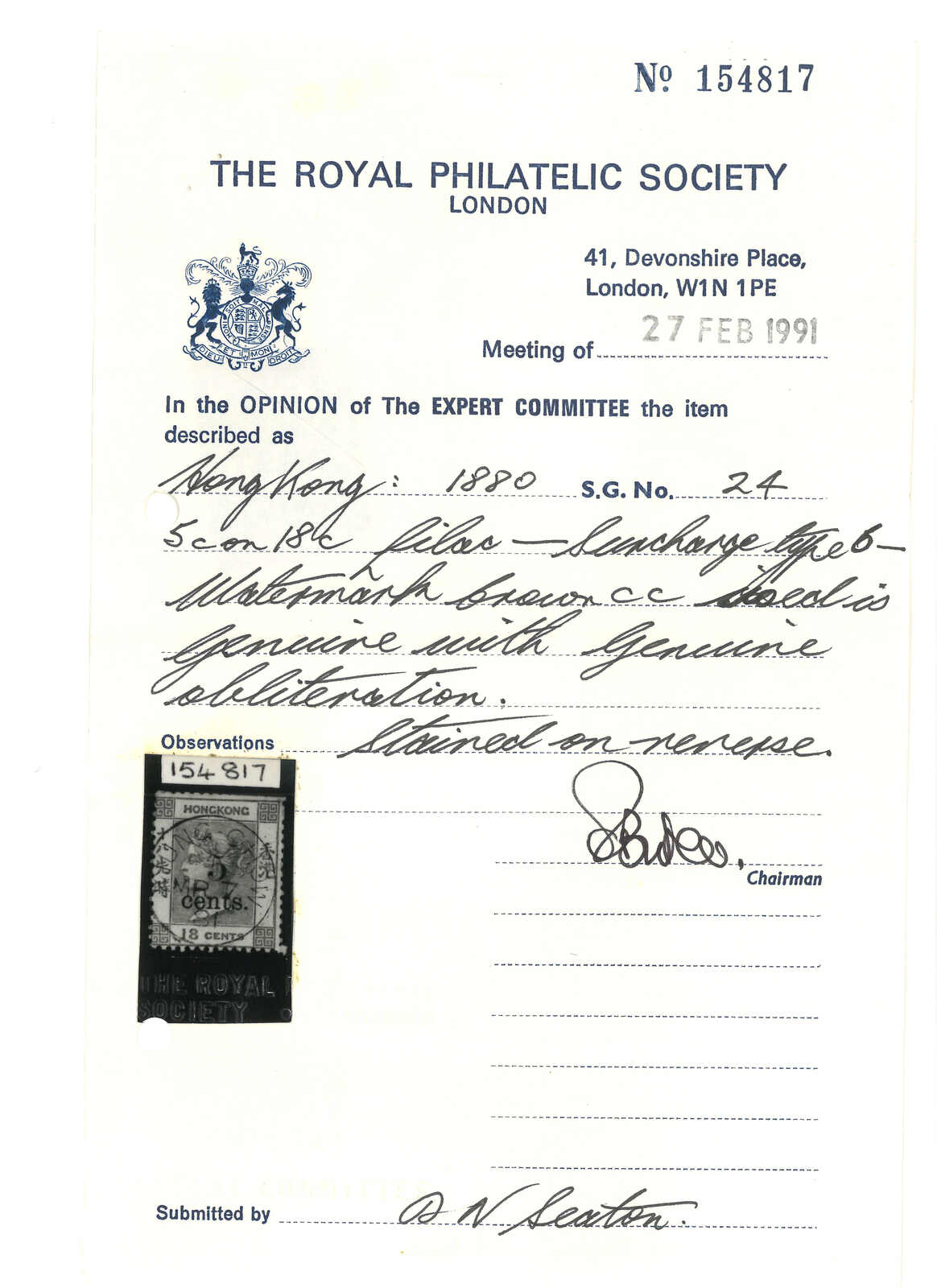 B型日戳,日期為1881年3月7日。為Webb記錄之13例中最晚一例。附皇家郵學會證書。(Image 1)