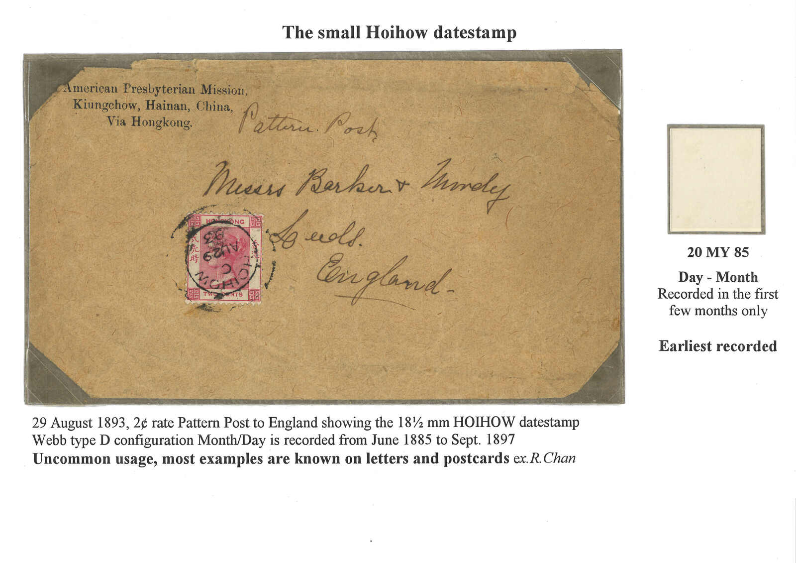 香港維多利亞女皇像5仙舊票,銷海口英局Webb D型日戳,日期為1885年5月20日。為該日戳之最早記錄。(Image 1)