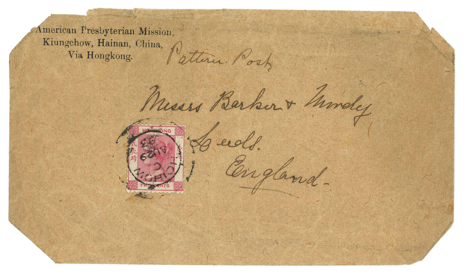 1893.8.29 海口寄英國,貼香港維多利亞女皇像2仙,付印刷品郵資,銷海口英局Webb D型日戳(帶外圈)。海口D型日戳之實寄封片本已少見,印刷品更是難得。陳卓堅舊藏。(Image 1)