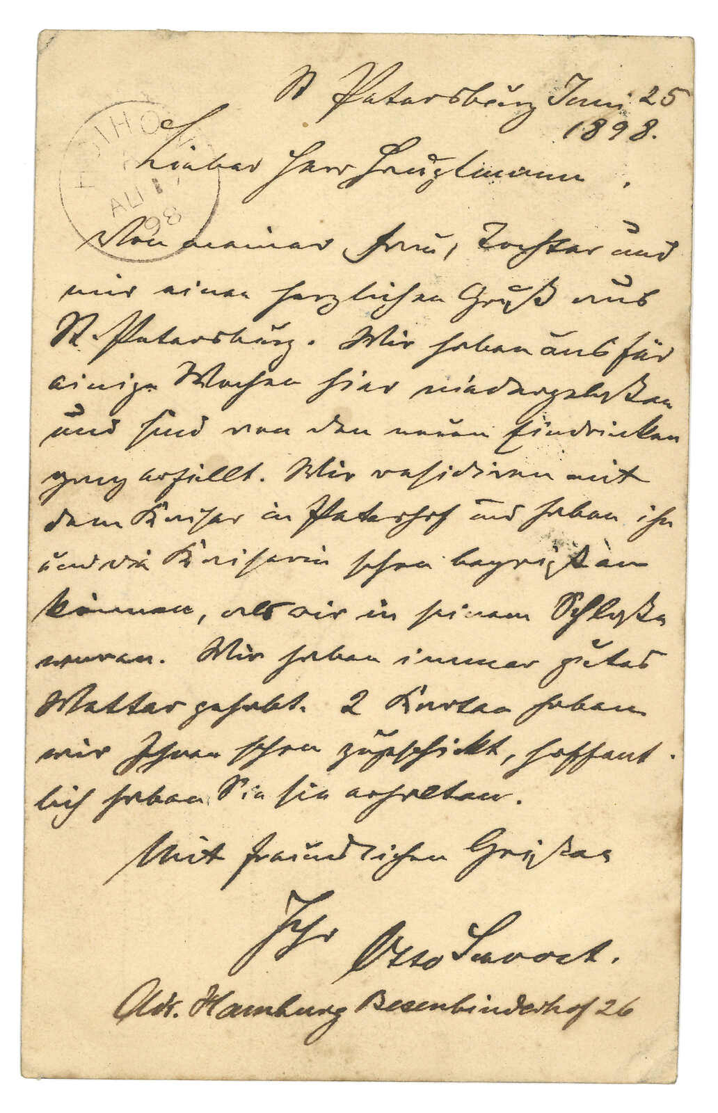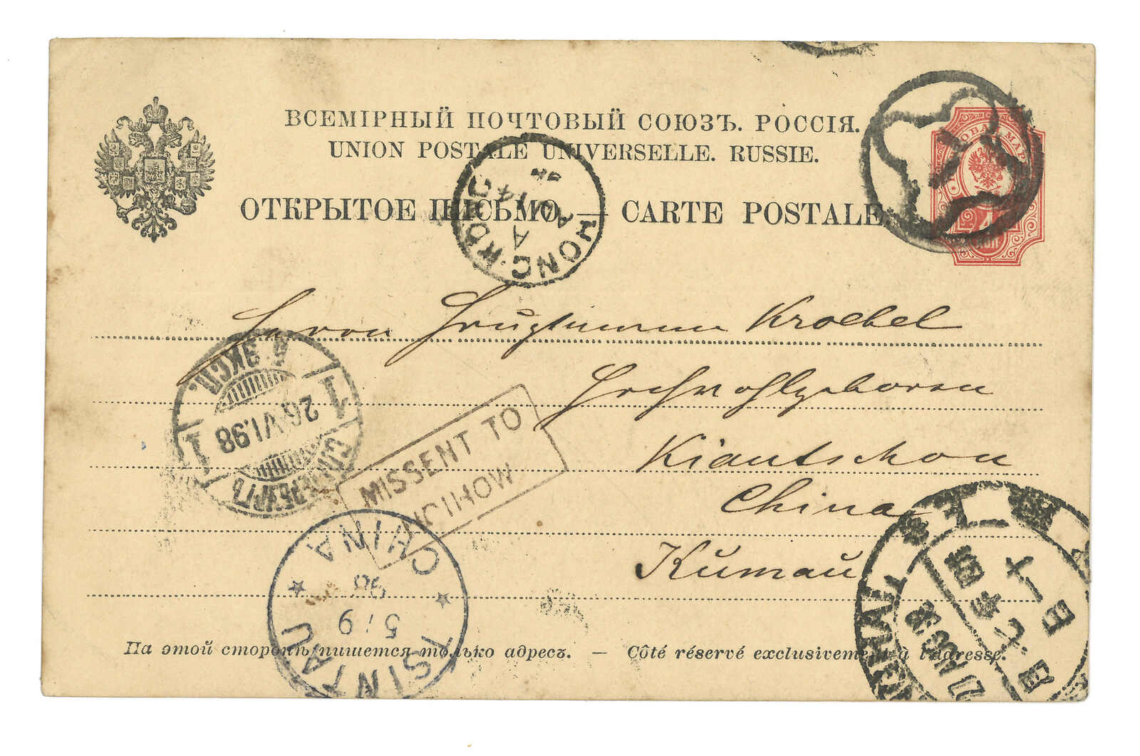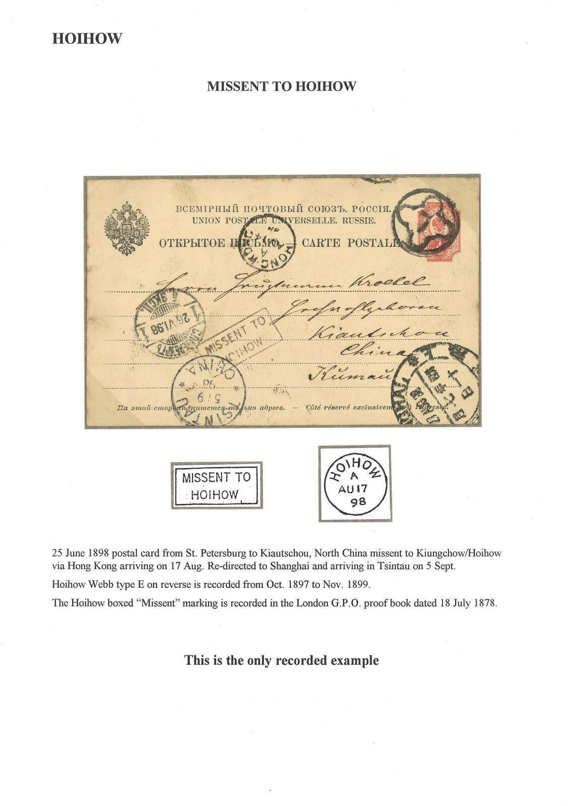 1898.6.25 俄國4戈比郵資片自聖彼得堡寄膠州,誤寄瓊州,鈐圓戳殺手戳及聖彼得堡始發日戳。8.14經香港。8.17抵海口英局,鈐Webb E型日戳及極罕之“MISSENT TO HOIHOW”橫戳。8.27經上海清郵改寄膠州。9.5抵青島德局。此為“MISSENT TO HOIHOW”橫戳之存世孤例。(Image