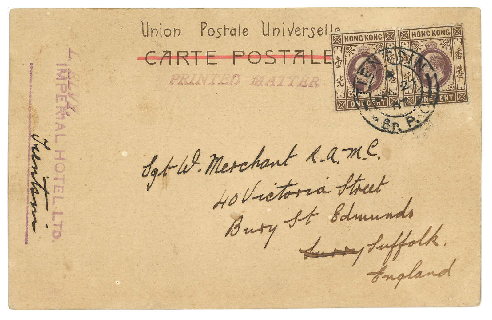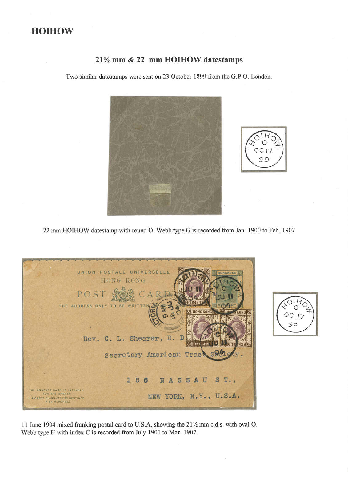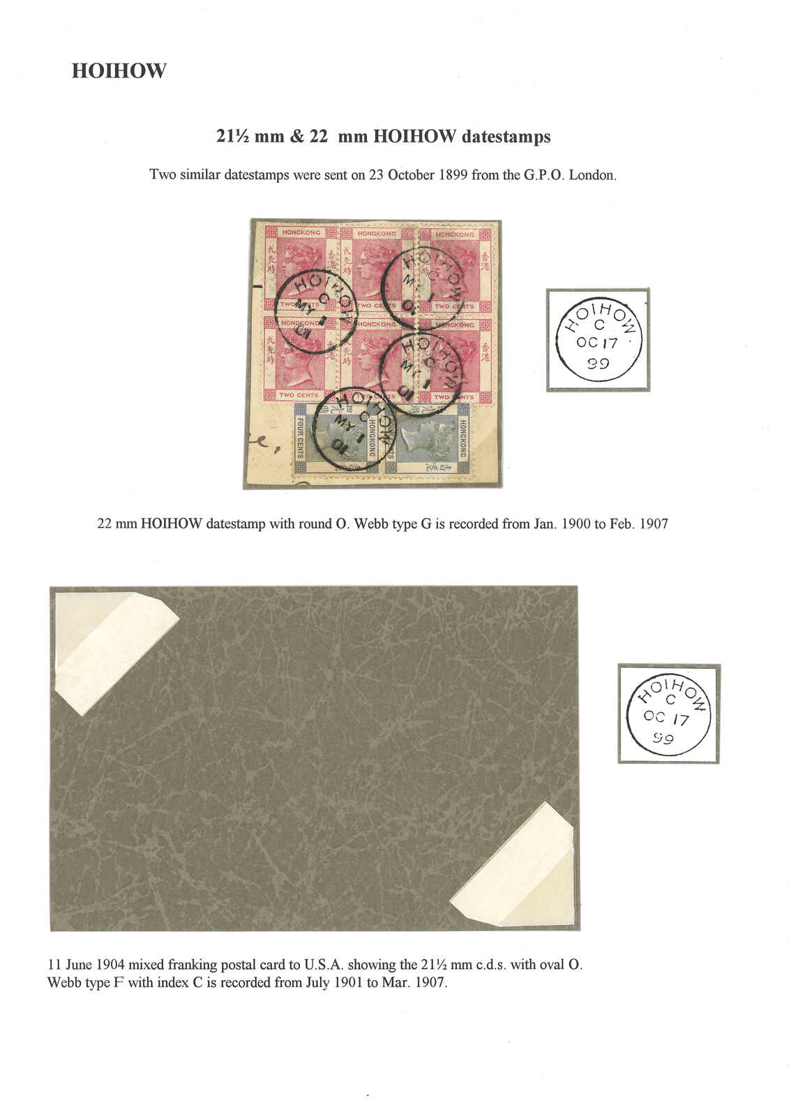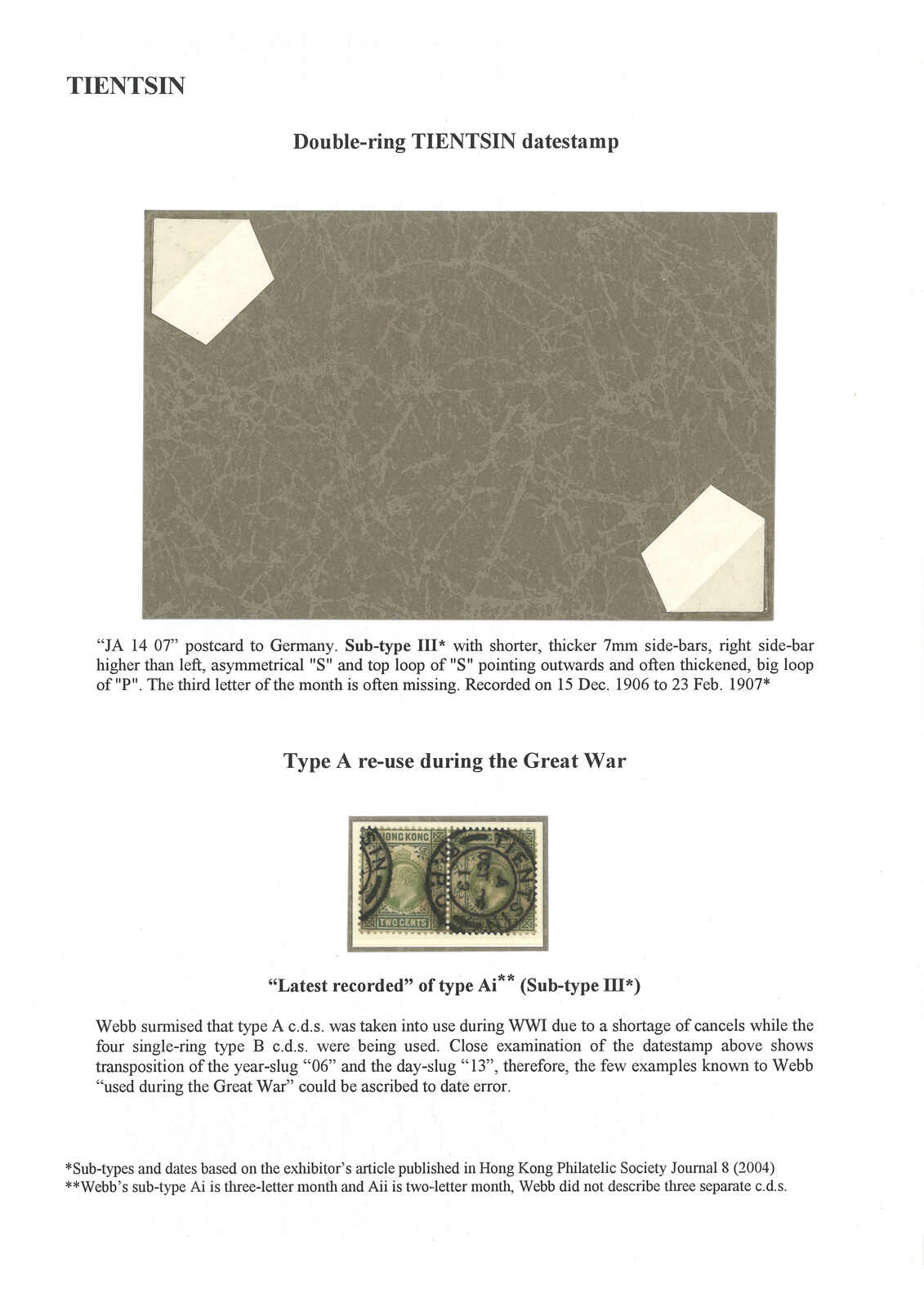 香港愛德華七世2仙橫雙連,銷天津英局Webb A型III亞型日戳,日期為“OCT 26 / 13”。Webb聲稱A型日戳在一戰期間重新投入使用,並指此為A型日戳之最晚記錄。但張文德醫生認為此戳僅是因年份及日期字粒對掉造成的錯體。有趣。(Image 1)