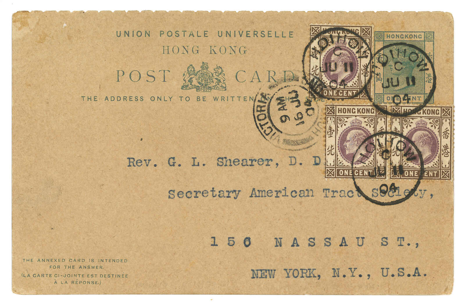 海口寄美國。香港維多利亞女皇像1仙郵資片,加貼愛德華七世1仙x3,銷海口英局Webb Fi(C字)日戳。6.16經香港。7.20抵紐約。(Image 1)