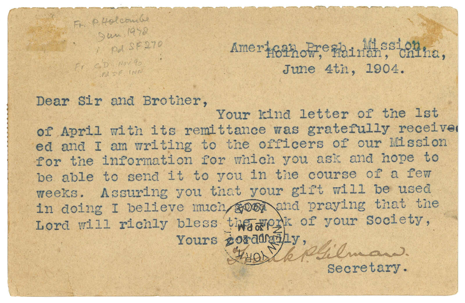 1904 Hoihow (11 Jun) to USA. Hong Kong QV 1c PSC, uprated by KEVII 1c x3, tied by Hoihow BPO Webb type Fi (index C) cds. Transit Hong Kong (16 Jun). Arrived New York (20 Jul).
