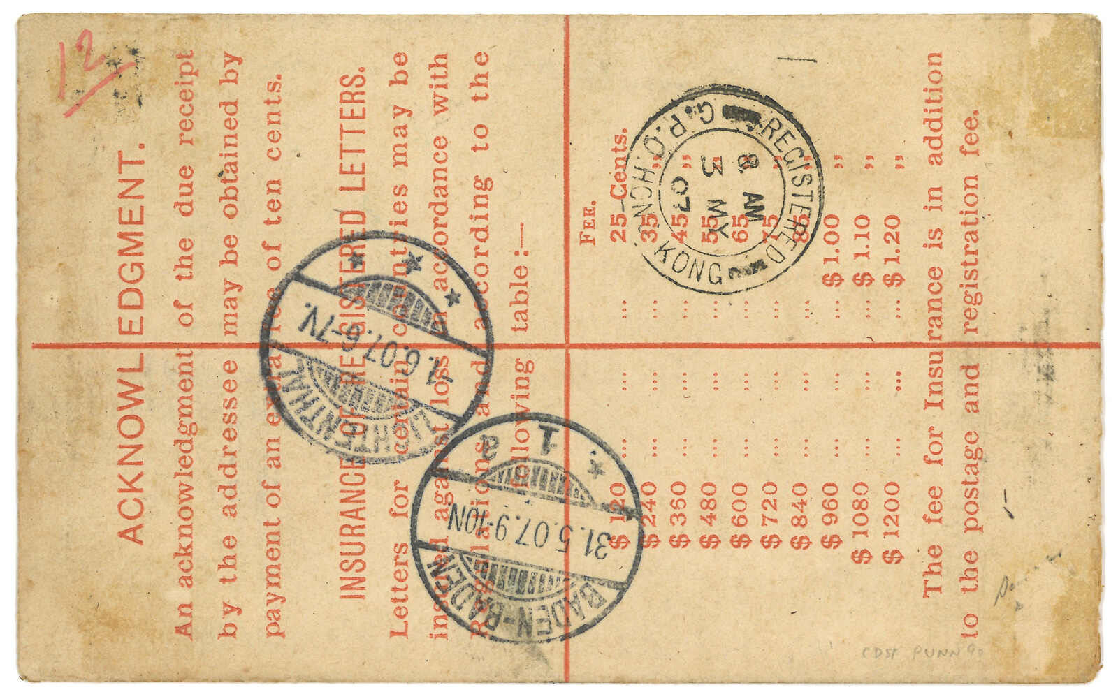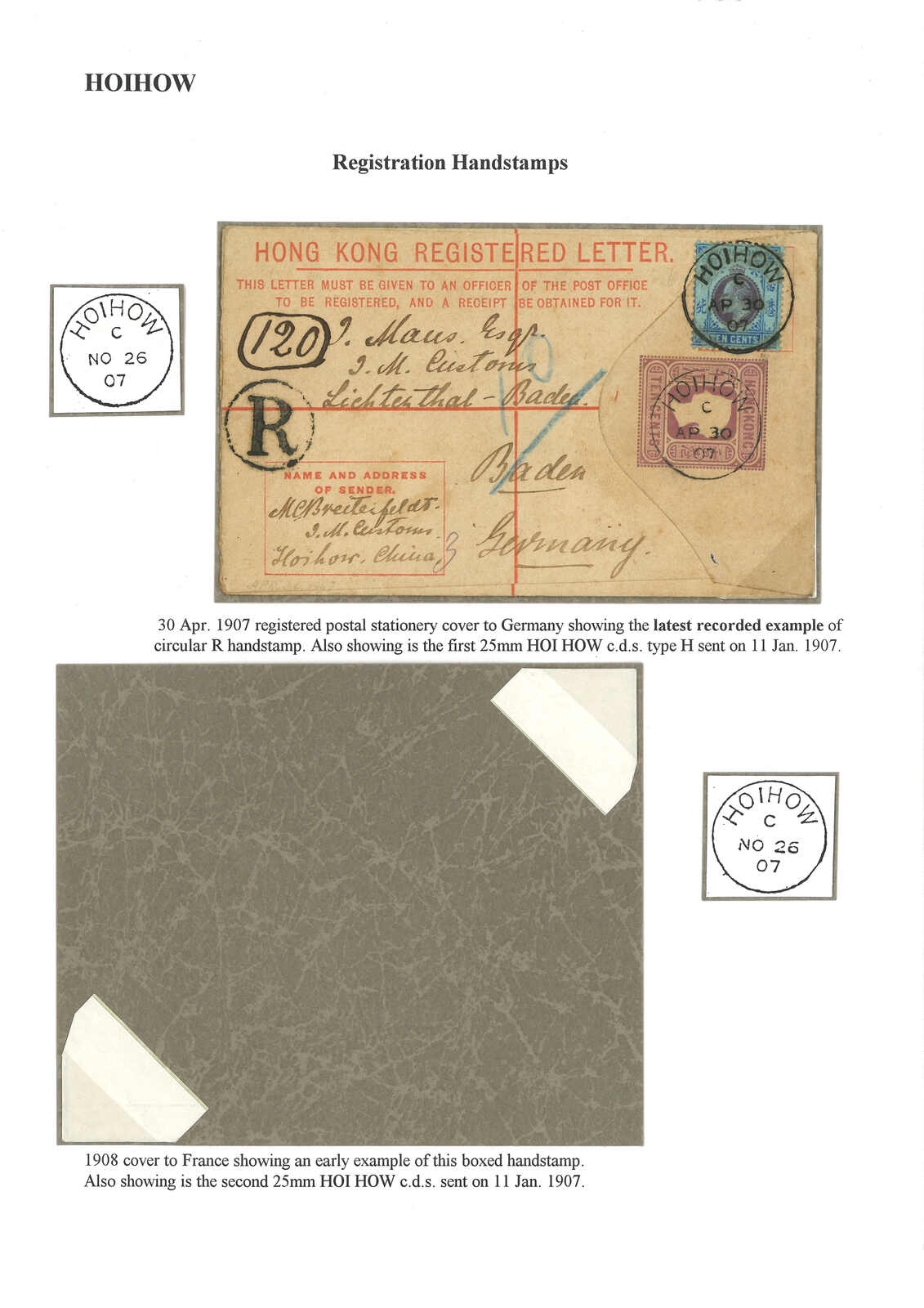 1907.4.30 海口寄德國的茂斯。香港維多利亞女皇像10仙掛號郵資封(Size F),加貼愛德華七世10仙,銷海口英局Webb Hi型日戳,鈐R1型帶圈R章。5.3經香港。6.1抵Lichtenthal。為該帶圈R章之最晚記錄。(Image 1)