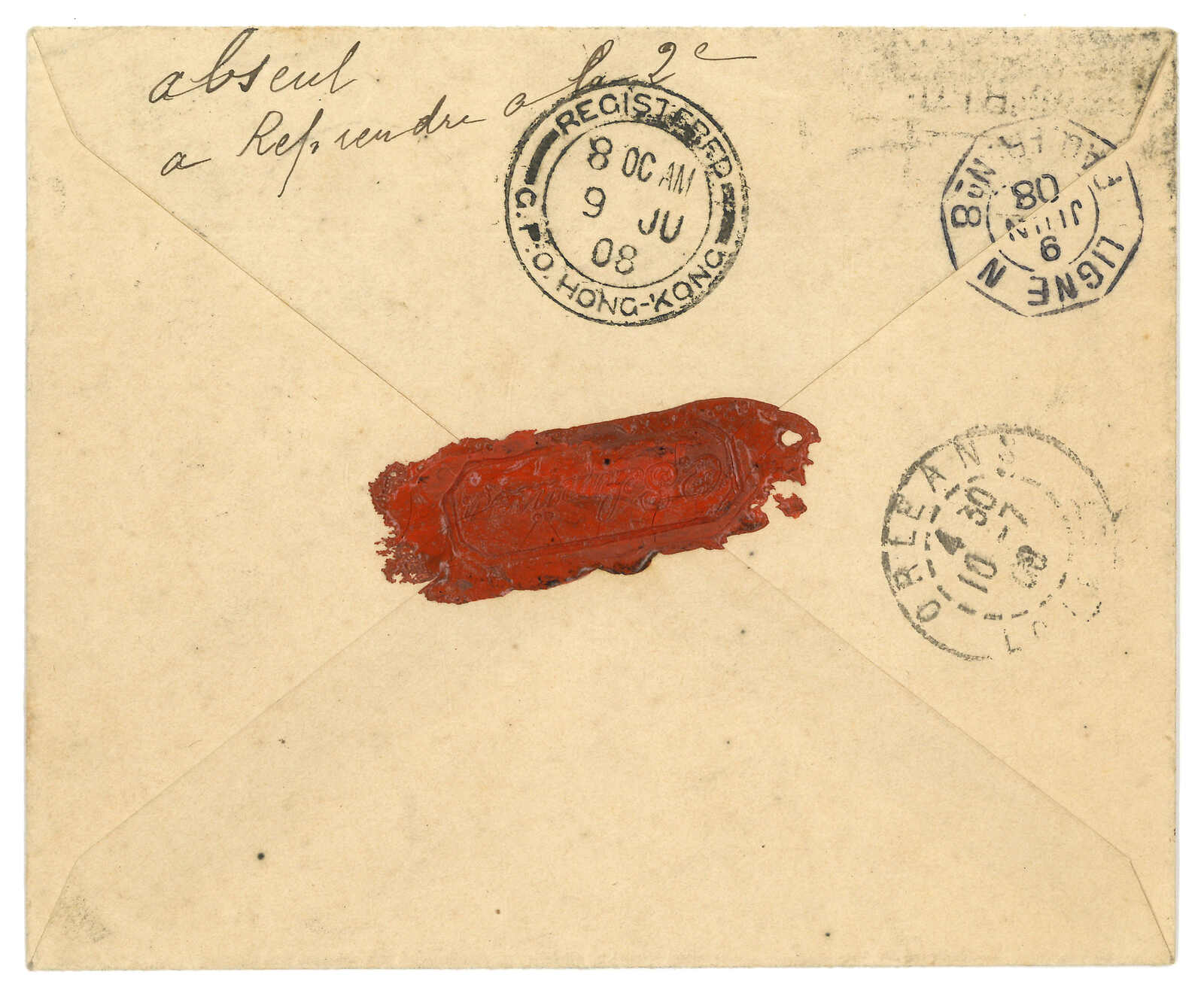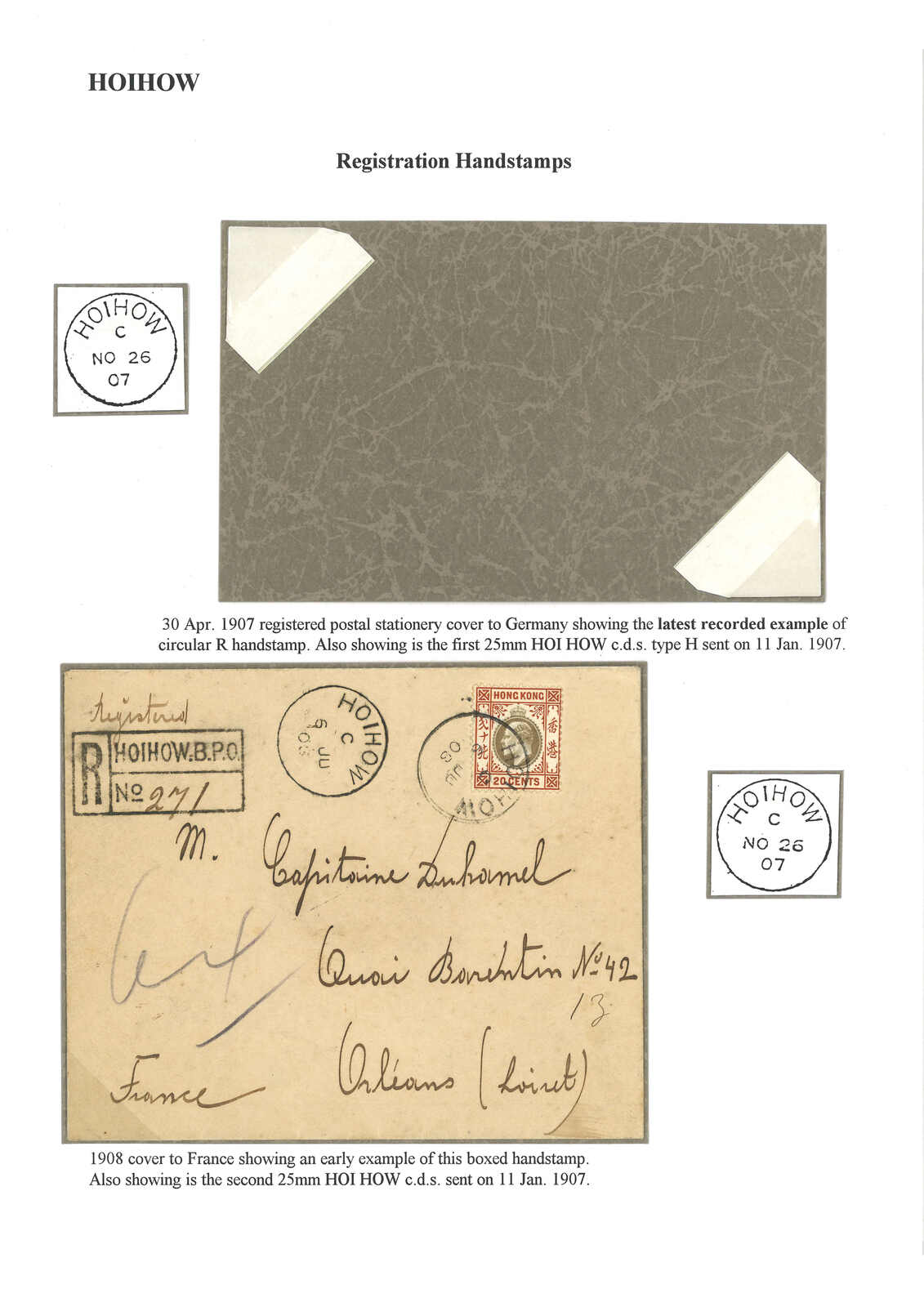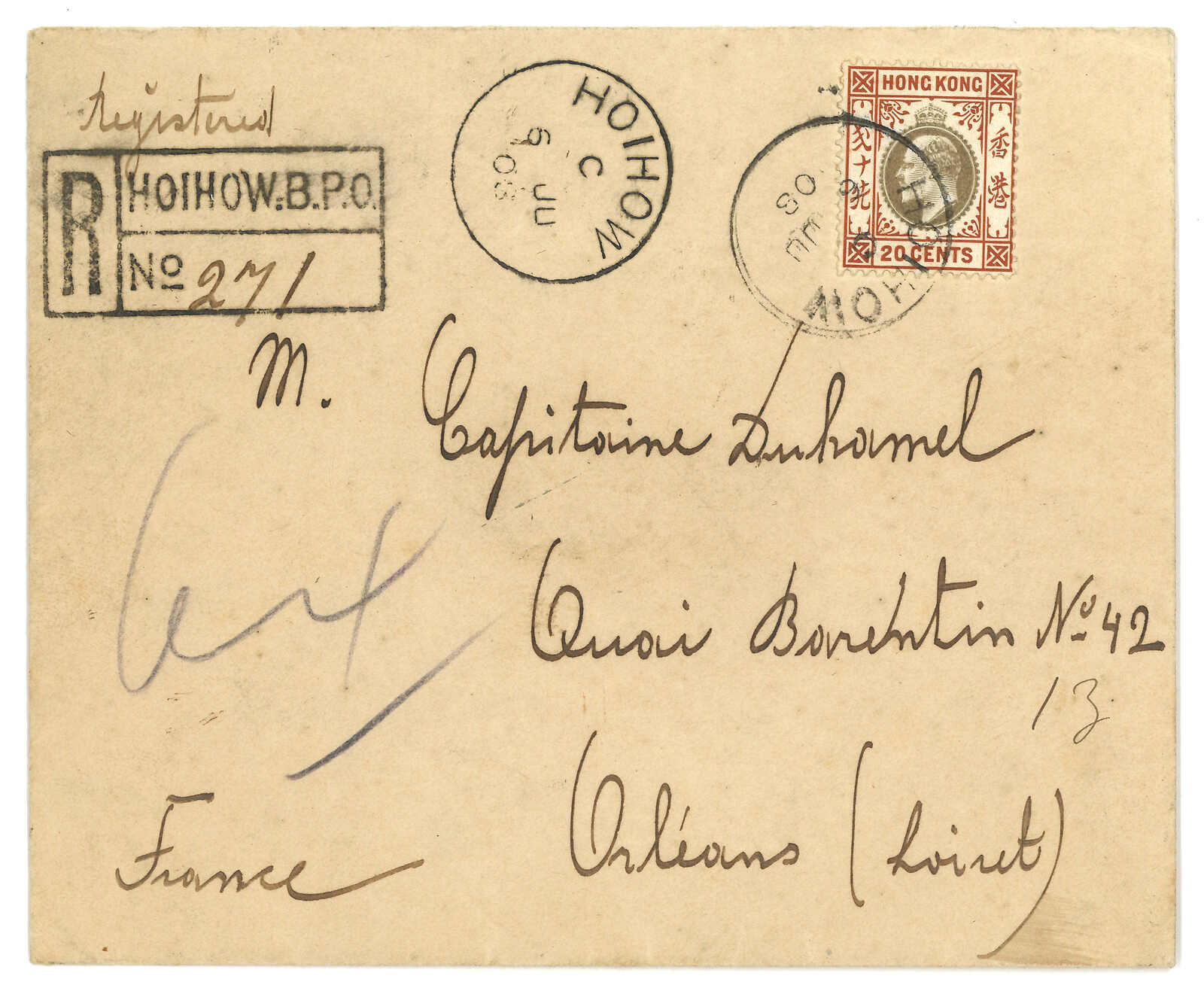 1908 Hoihow (6 Jun) to France, f.w. Hong Kong KEVII 20c, tied Hoihow BPO Webb type Hi cdsm, alongside with "HOIHOW B.P.O." boxed registered mark. Transit Hong Kong (9 Jun), French paquebot Ligne N (9 Jun). Arrived Orlean (10