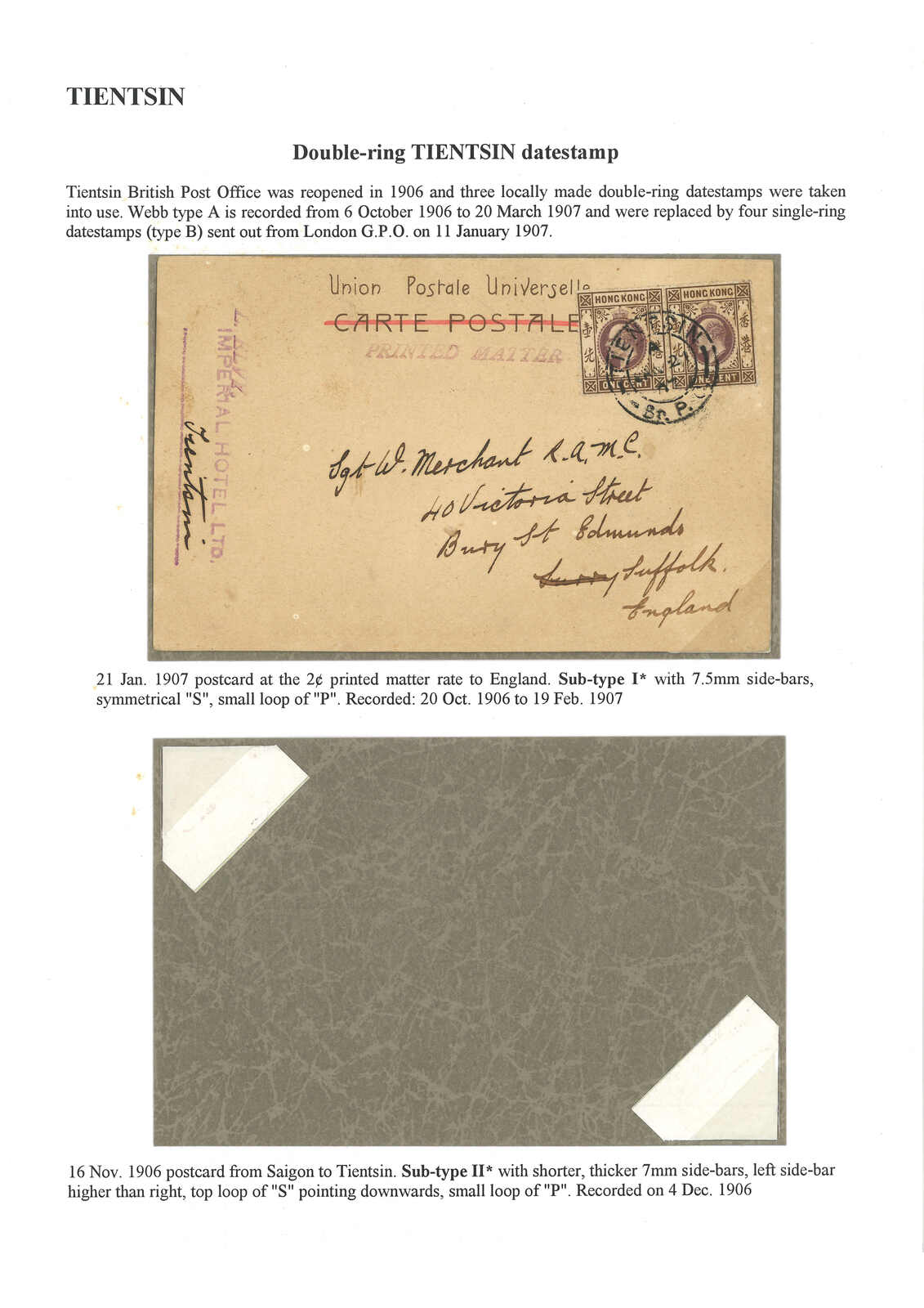 1907 Tientsin (21 Jan) to England. Picture postcard, f.w. Hong Kong KEVII 1c in pair, tied by Tientsin BPO Webb type A subtype I cds. Dr. Andrew Cheung recorded the usage of subtype I cds between 20 Oct 1906 and 19 Feb 1907.
