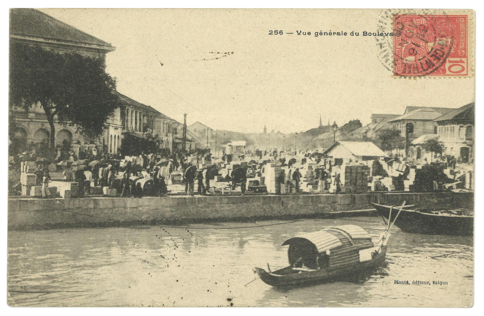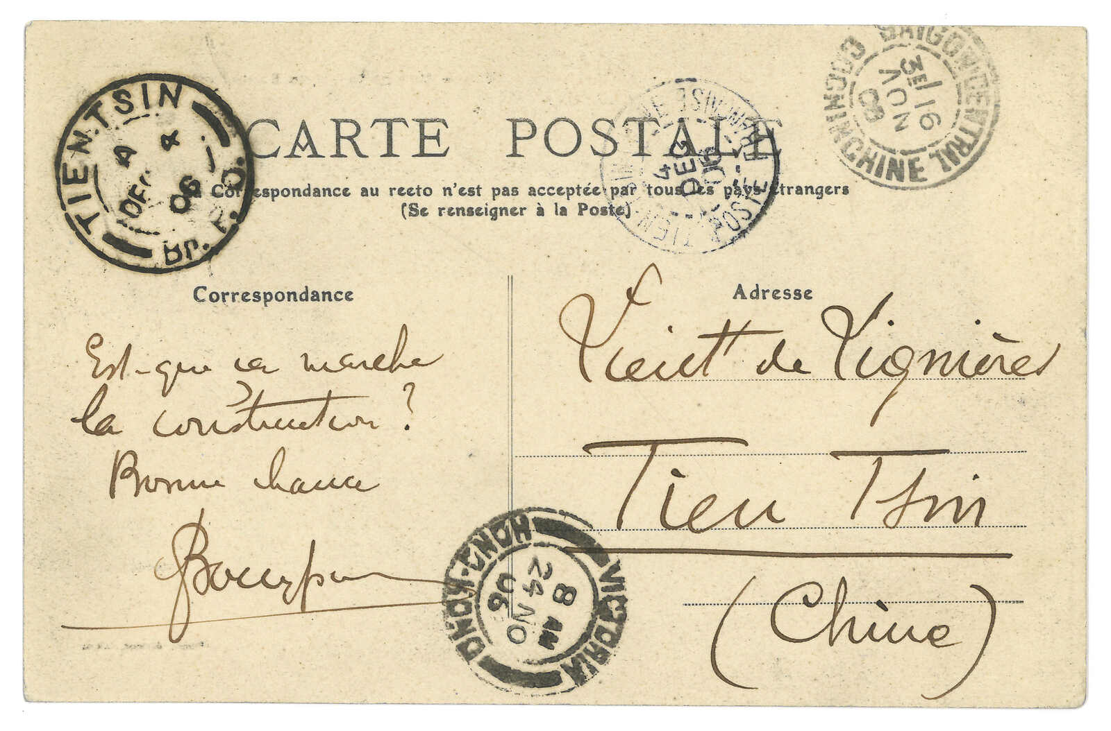 1906 Saigon (16 Nov) to Tientsin. Picture postcard, f.w. France type 10c on image side, tied by Saigon cds. Transit Hong Kong (24 Nov), Tientsin French PO (4 Dec). Arrived Tientsin BPO (4 Dec) with Webb type A subtype II cds.