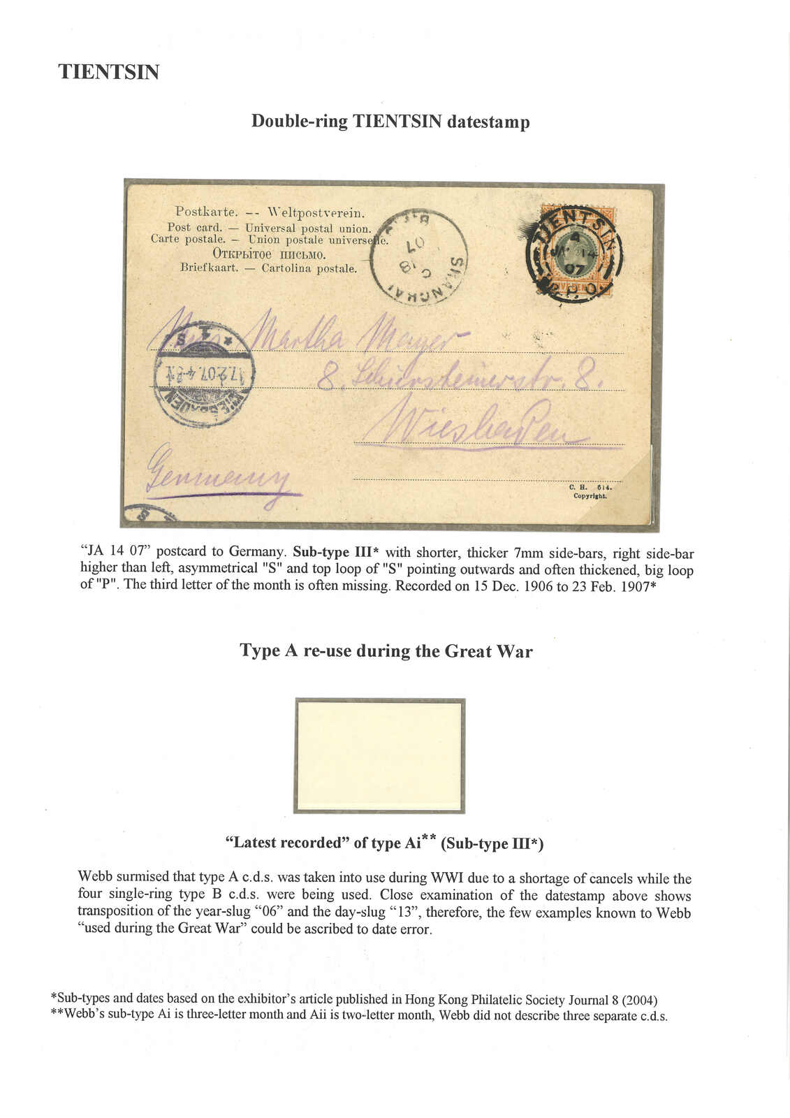 1907.1.14 天津寄德國。圖片明信片,貼香港愛德華七世5仙,銷天津英局Webb A型III亞型日戳。1.18經上海英局。2.17抵Wiesbaden。張文德醫生記錄III亞型日戳僅於1906年12月15日至1907年2月23日使用。(Image 1)