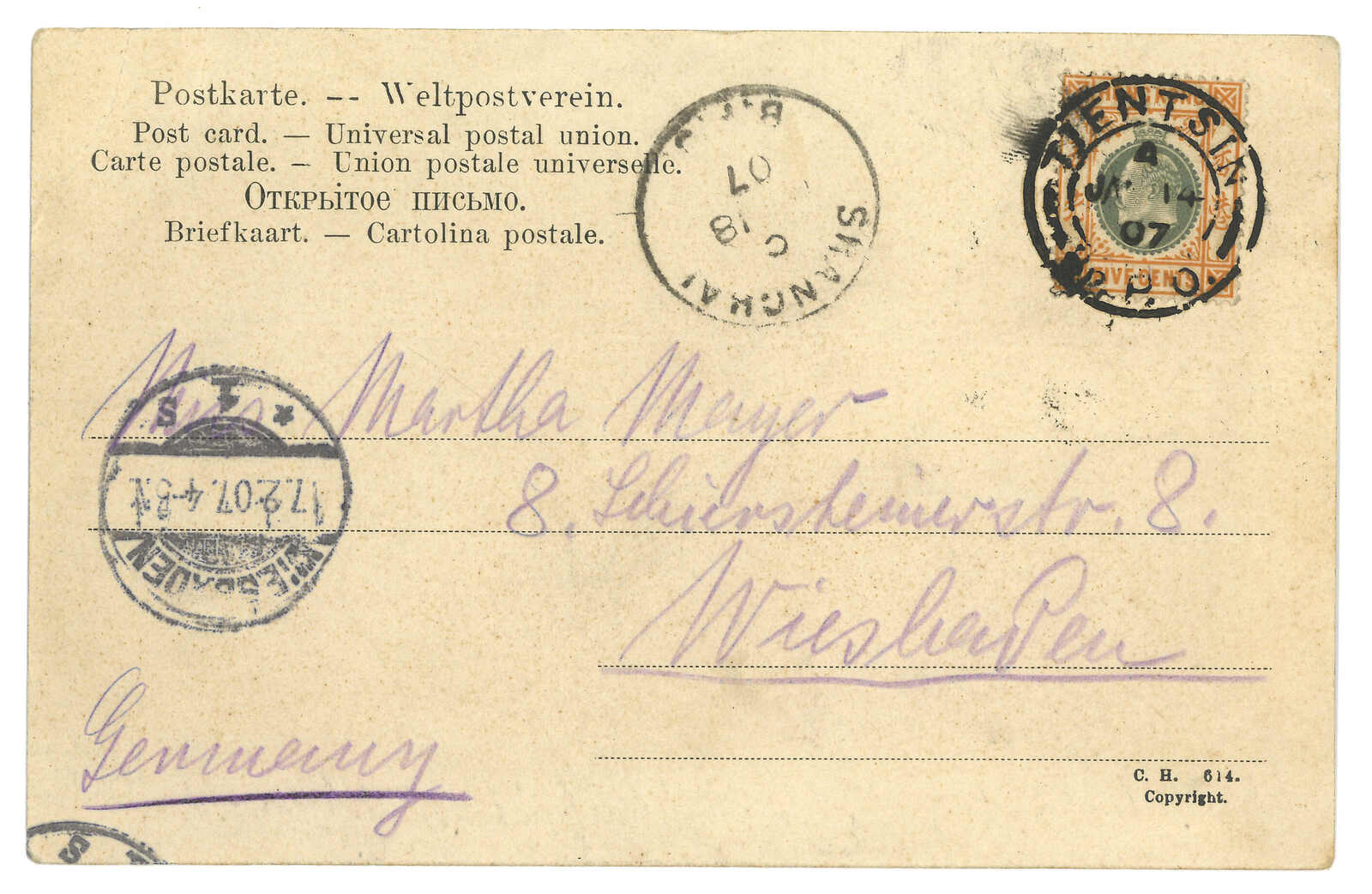 1907 Tientsin (14 Jan) to Germany. Pictrure postcard, f.w. Hong Kong KEVII 5c, tied by Tientsin BPO Webb type A subtype III cds. Transit Shanghai BPO (18 Jan). Arrived Wiesbaden (17 Feb). Dr. Andrew Cheung recorded the usage of