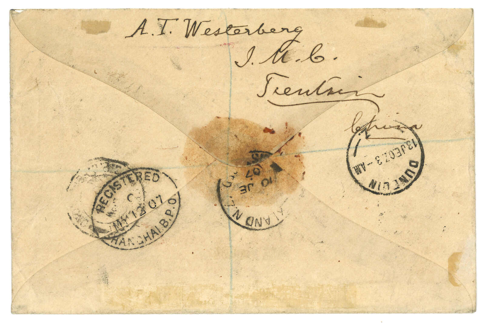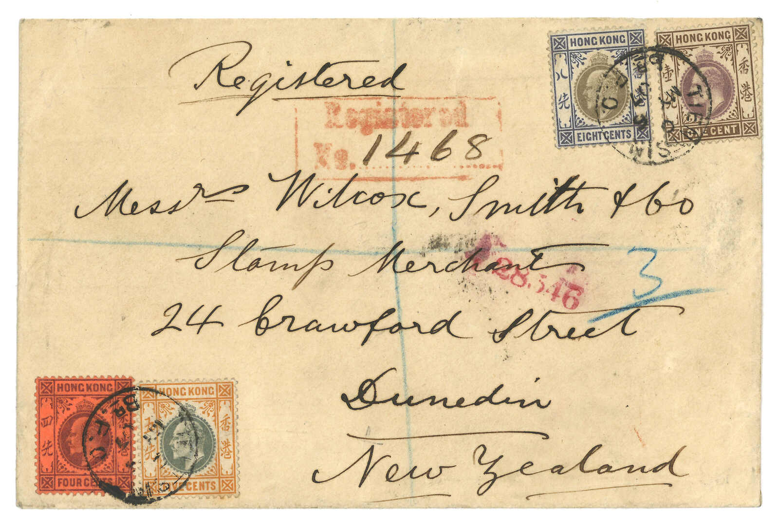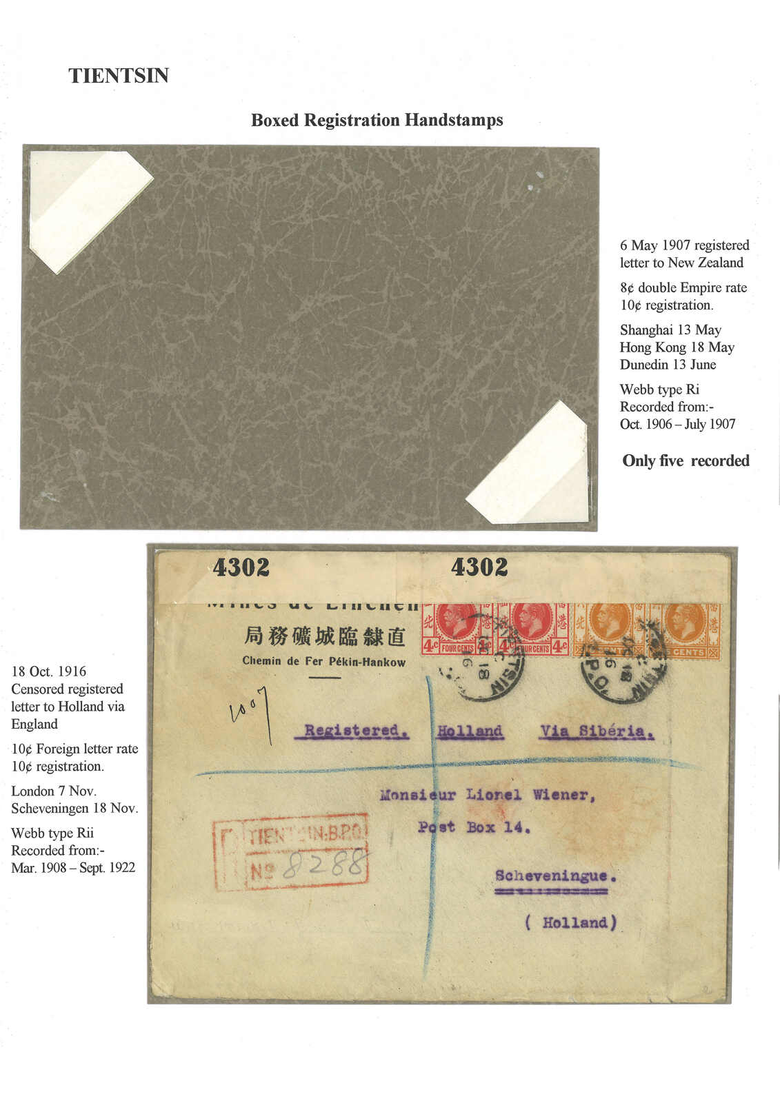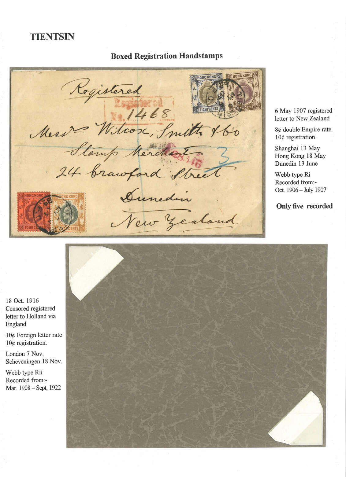 1907.5.6 天津寄新西蘭,貼香港愛德華七世1仙 + 4仙 + 5仙 + 8仙,銷天津英局Webb B型日戳,旁鈐少見之Ri型掛號橫戳。5.13經上海英局,5.18經香港。6.13抵Dunedin。為Ri型掛號章之存世五例之一。(Image 1)