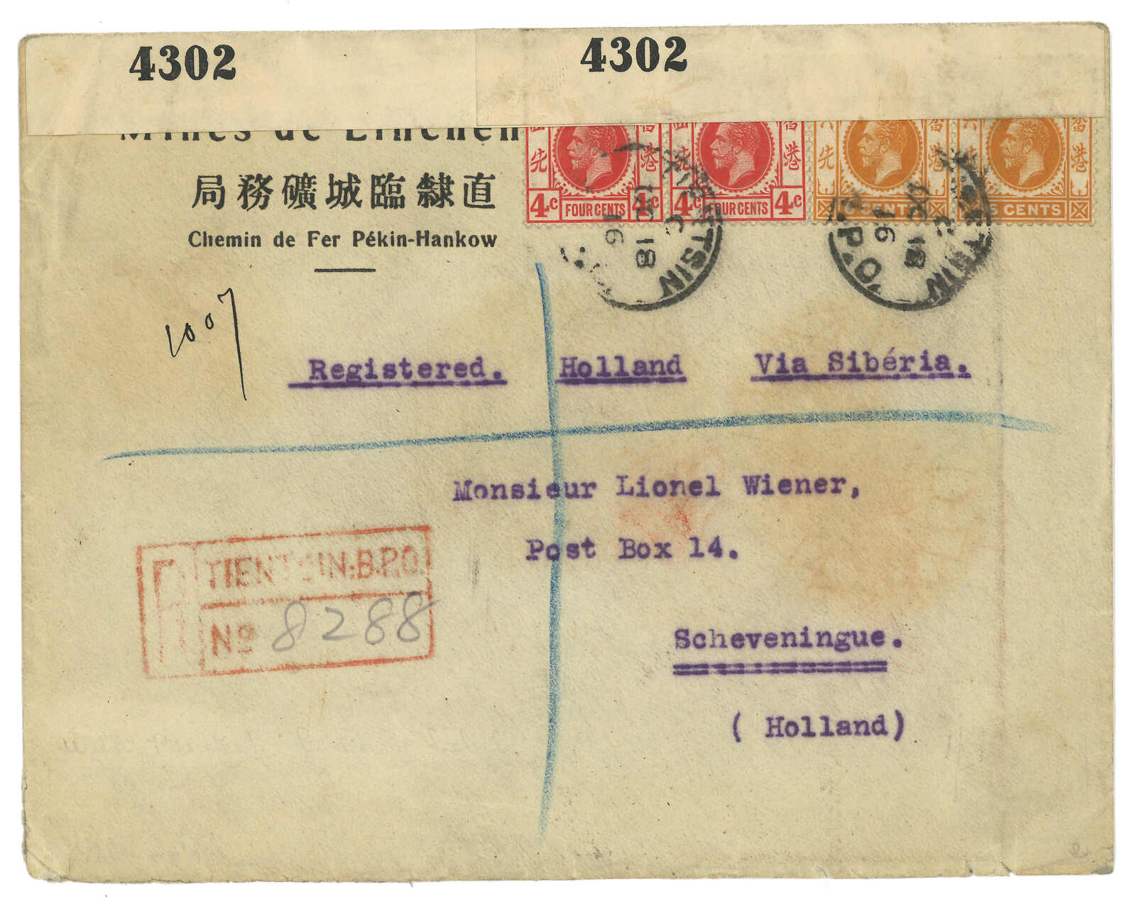 1916 Tientsin (18 Oct) to Holland. WWI censor registered cover, f.w. Hong Kong KGV 4c in pair + 6c in pair, tied by Tientsin BPO Webb type B cds., alongside with type Rii "TIENTSIN B.P.O." registered mark. Transit London (7
