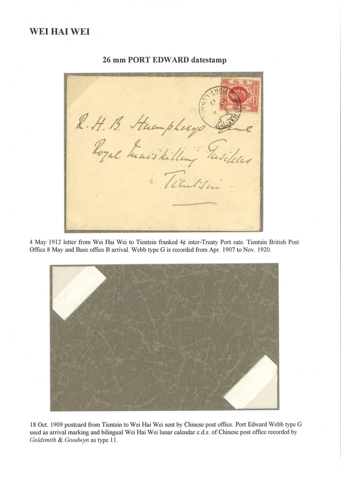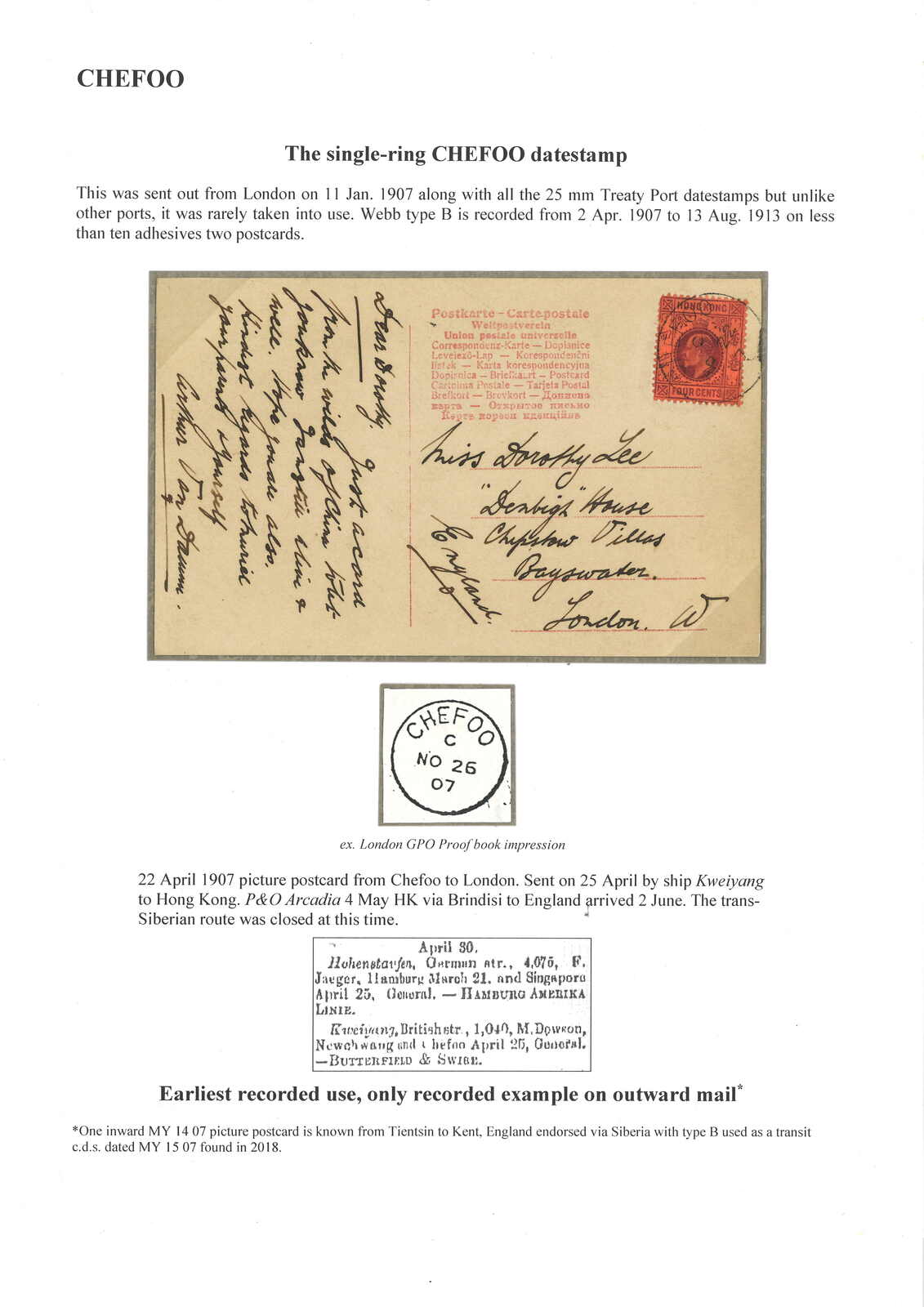 1907 Chefoo (22 Apr) to England. Picture postcard, f.w. Hong Kong KEVII 4c, tied by extremely scarce Chefoo BPO Webb type B cds. Webb recorded that this cds was only recorded on 4 adhesives. Dr. Andrew Cheung, however, recorded