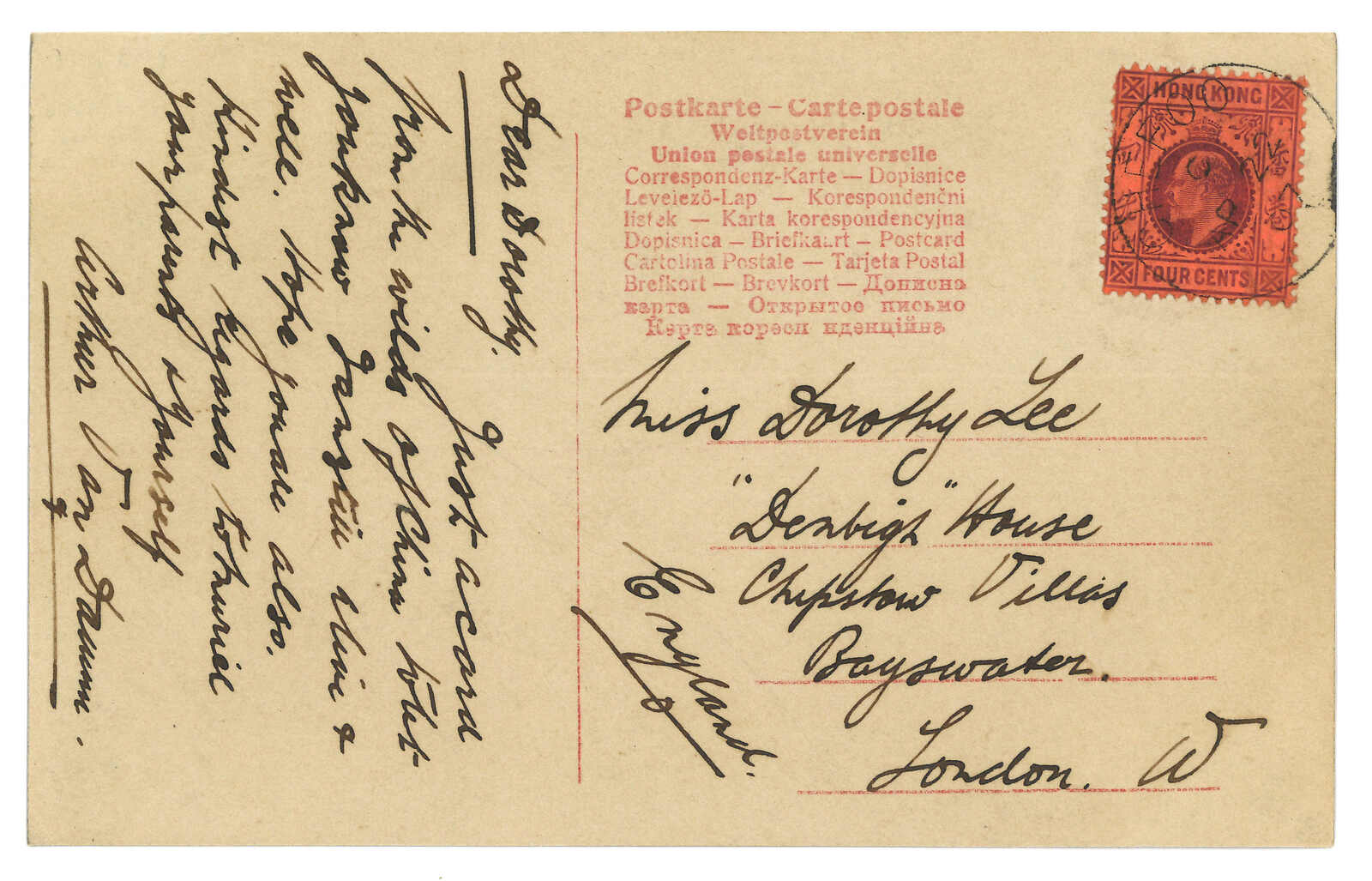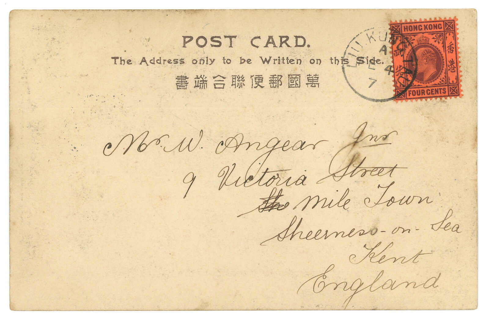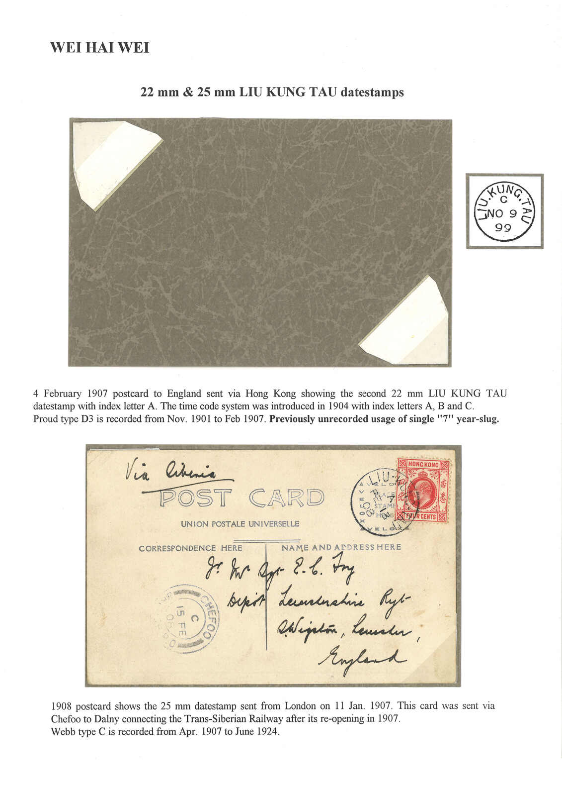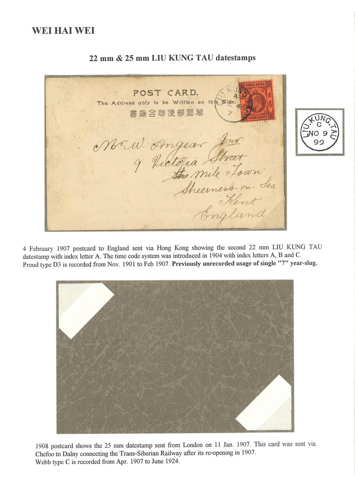1907 Liu Kung Tau (4 Feb) to England. Picture postcard, f.w. Hong Kong KEVII 4c, tied by Liu Kung Tau BPO Webb type B index A cds. Transit Hong Kong (11 Feb). Early type B cds are mostly without index but index A, B and C begun