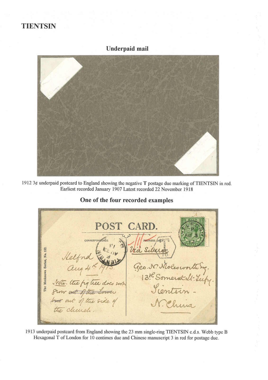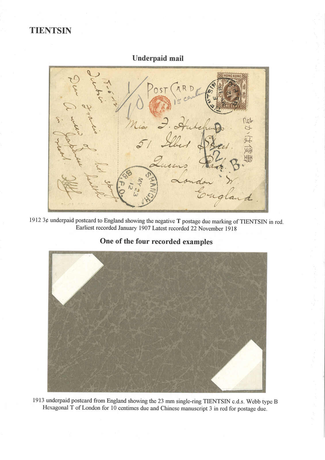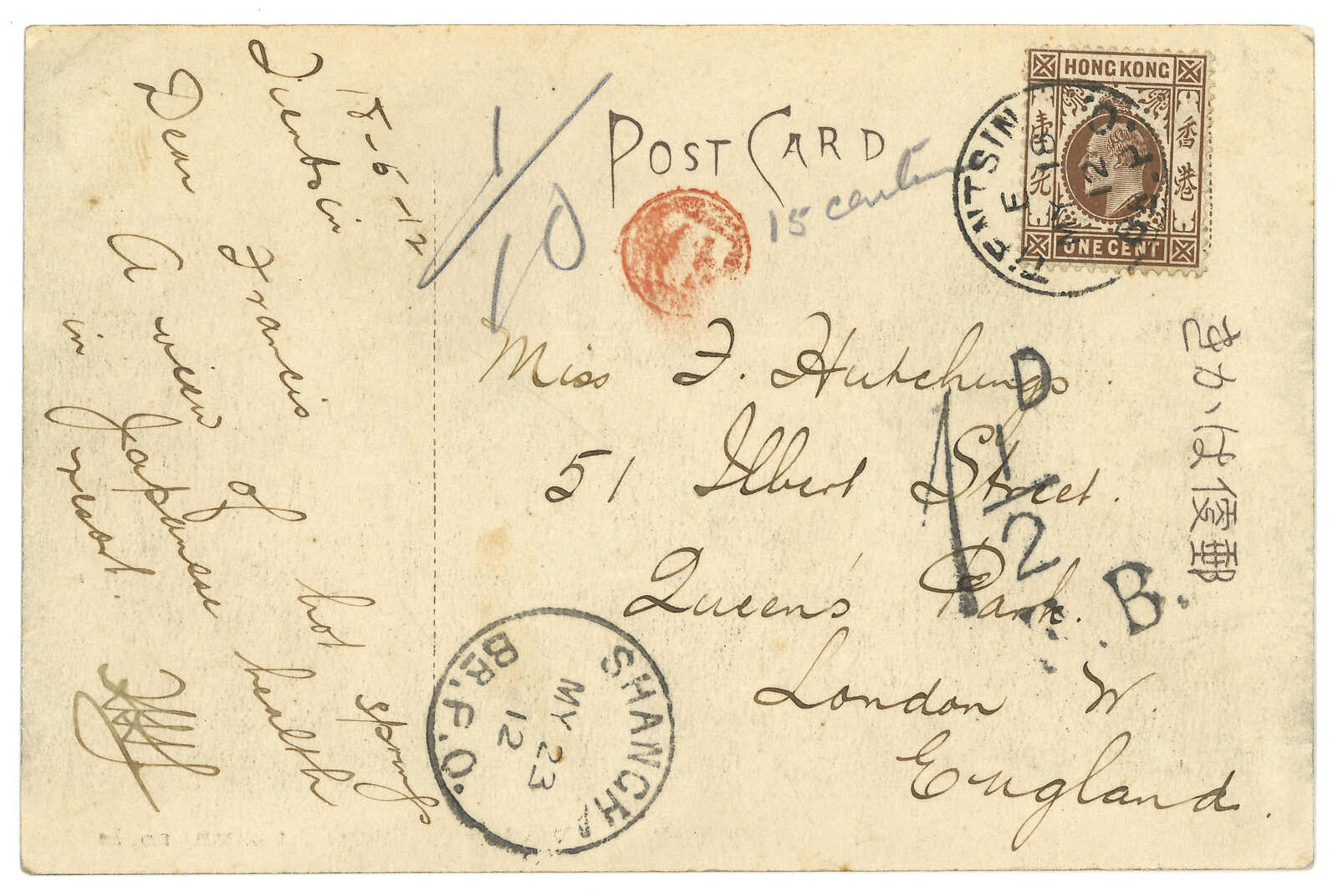 1912 Tientsin (18 May) to England. Picture postcard, f.w. Hong Kong KEVII 1c, tied by Tientsin BPO Webb type B cds, alongside with negative T mark in red. Transit Shanghai BPO (23 May). 1-1/2d postage due was levied upon