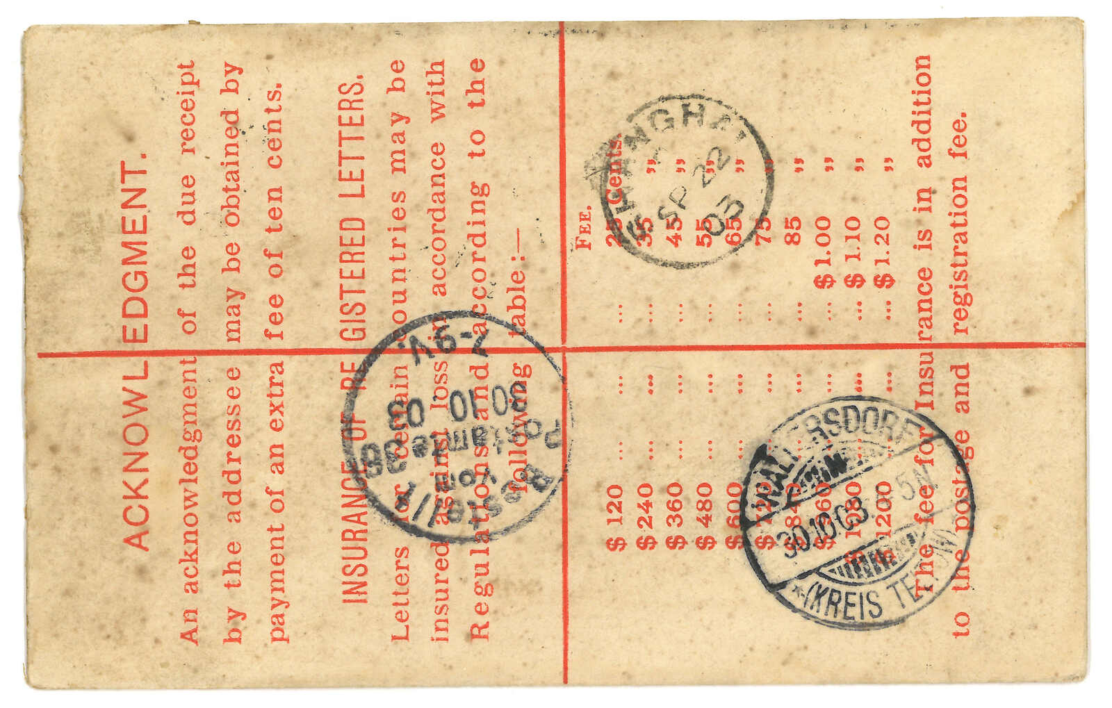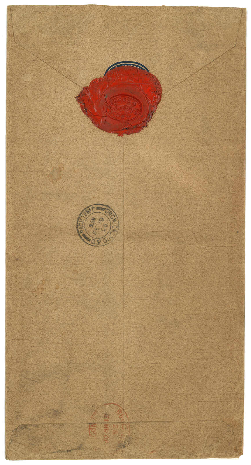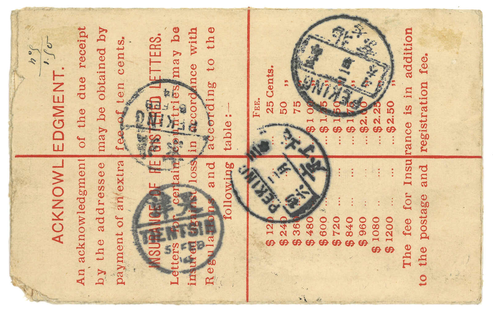 Arrived Peking (8 Feb). One of the 5 examples of type R2 registered mark.