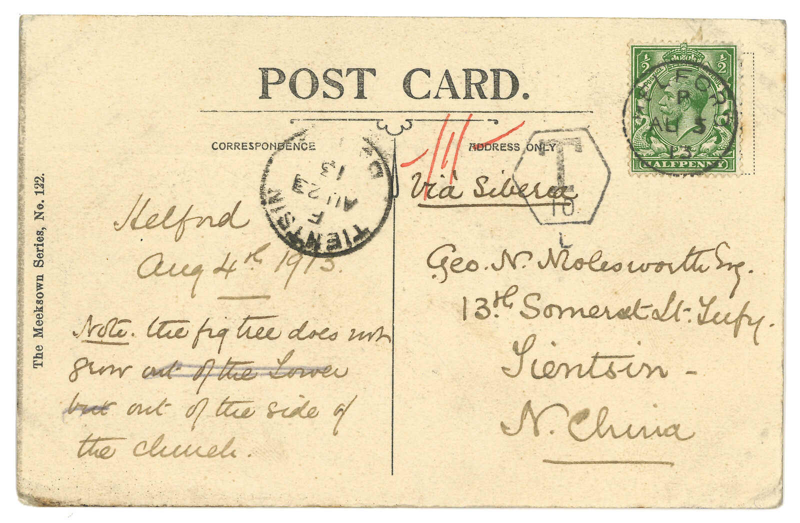 1913 England (5 Aug) to Tientsin. Picture postcard, f.w. KGV 1/2d, tied by Melford cds, alongside with hexagonal T mark. Arrived Tientsin BPO (23 Aug) with Webb type B cds. Showing Chinese manuscript of "3" for postage due.