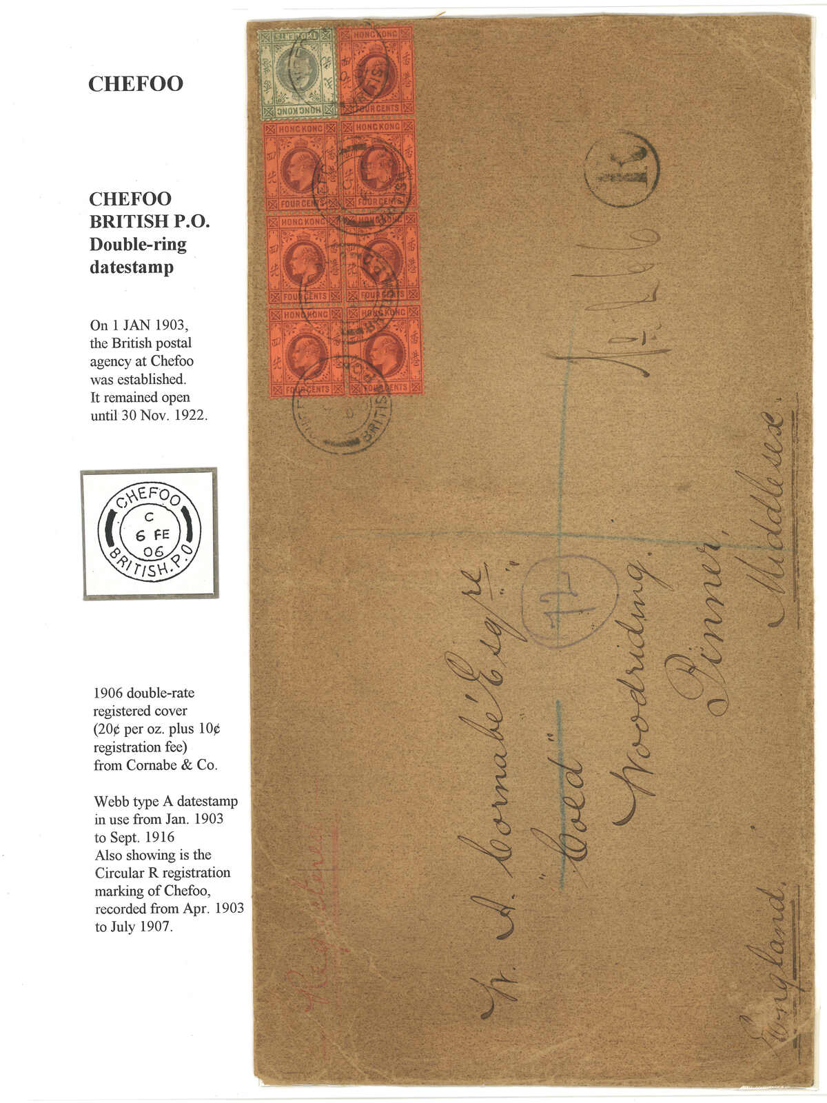 1906 Chefoo (6 Feb) to England. Registered cover, f.w. Hong Kong KEVII 4c x7 + 2c, tied by Chefoo BPO Webb type A cds, alongside with circled R mark. Transit Hong Kong (19 Feb), London (21 Mar). On reverse with Cornabe & Co