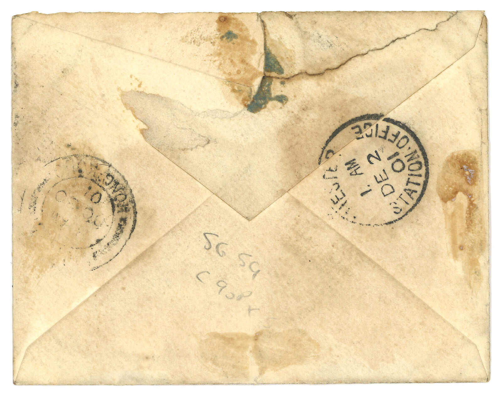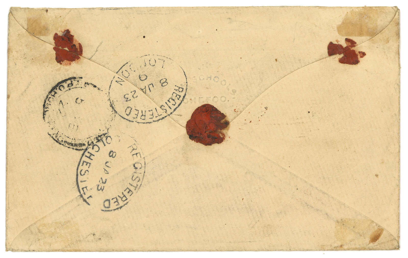 B.P.O.”長方形掛號戳。12.5經香港,1.8經倫敦。1.8抵Colchester。於煙台英局關閉(11月30日)前三天寄出。(Image 1)