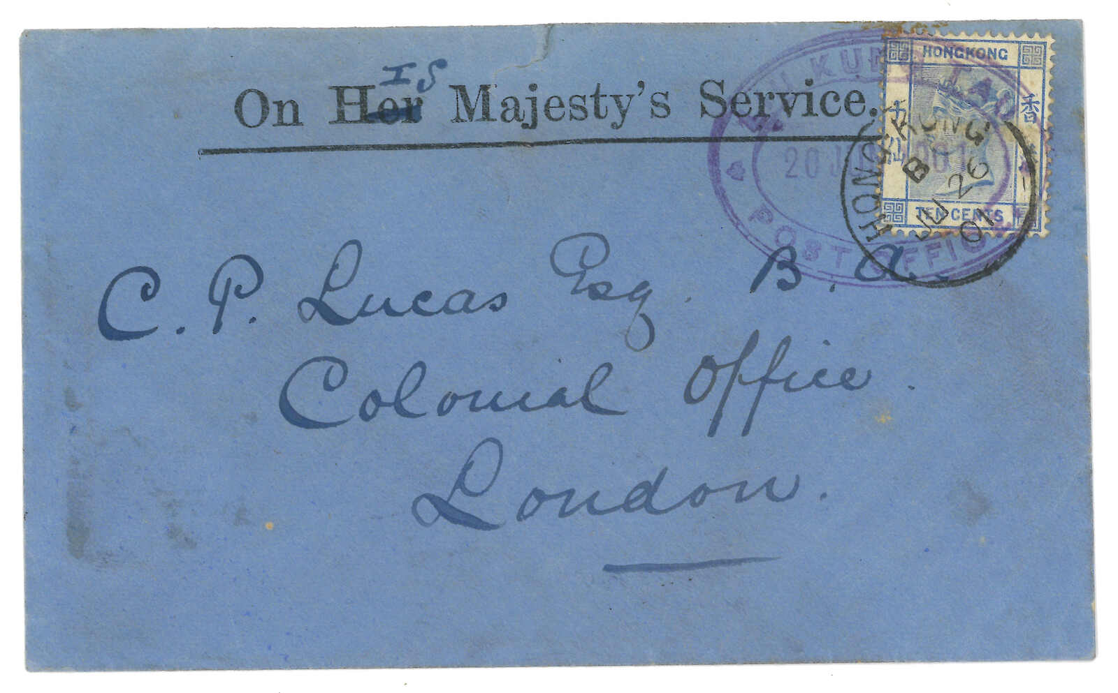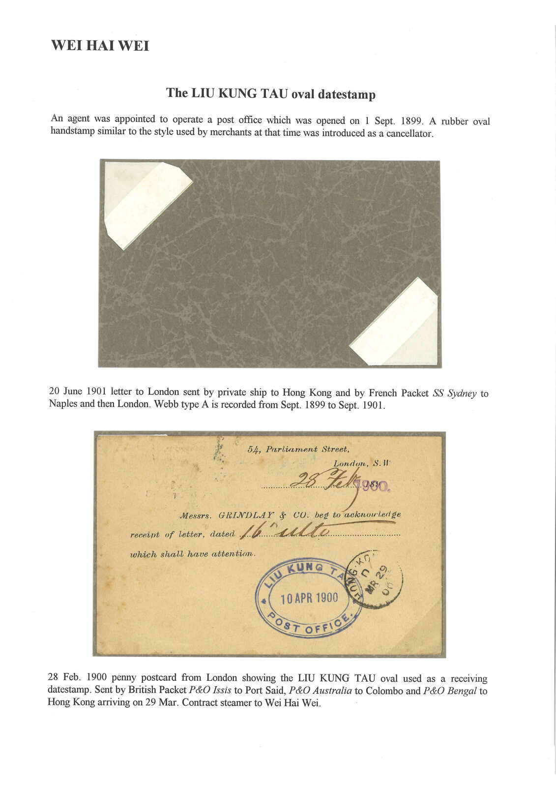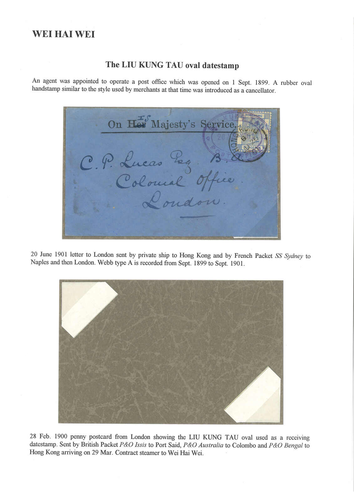 1901 Liu Kung Tau (20 Jun) to England. OHMS cover, f.w. Hong Kong QV 10c, tied by Liu Kung Tau BPO Webb type A oval d.s. in violet. Transit Hong Kong (26 Jun) and applied cds on adhesive. The earliest record of this d.s. by