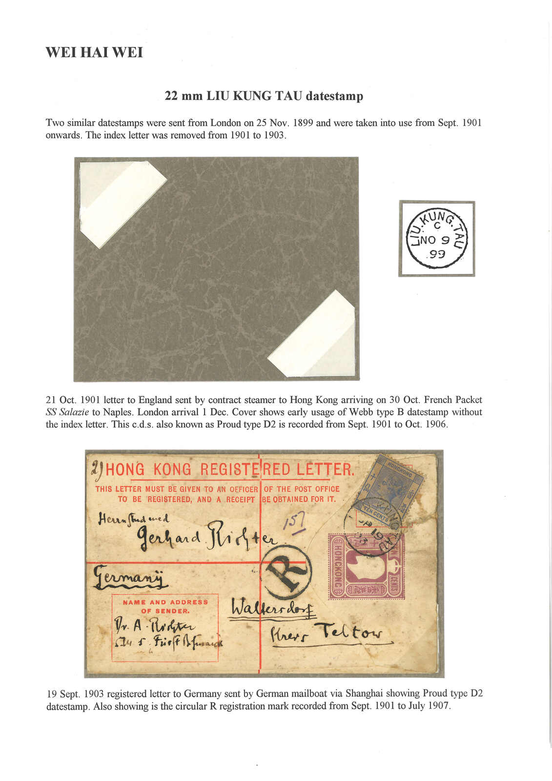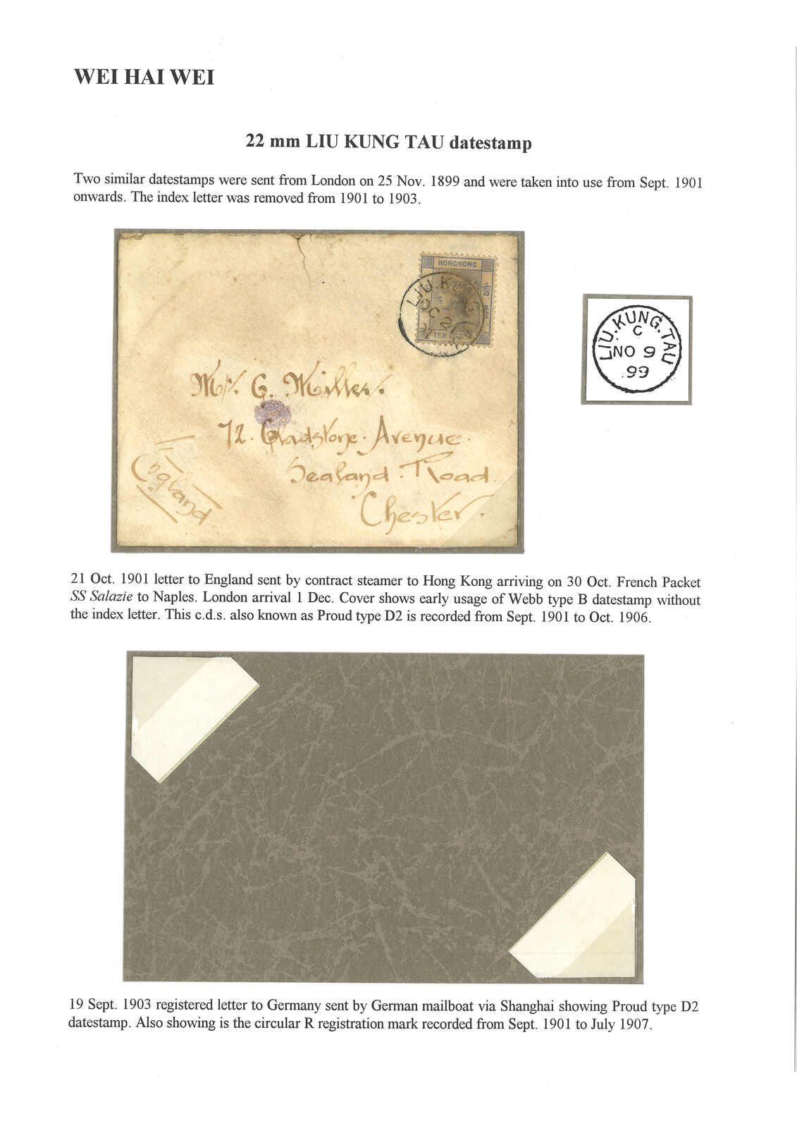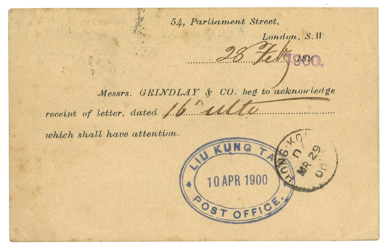 1901 Liu Kung Tau (20 Jun) to England. OHMS cover, f.w. Hong Kong QV 10c, tied by Liu Kung Tau BPO Webb type A oval d.s. in violet. Transit Hong Kong (26 Jun) and applied cds on adhesive. The earliest record of this d.s. by