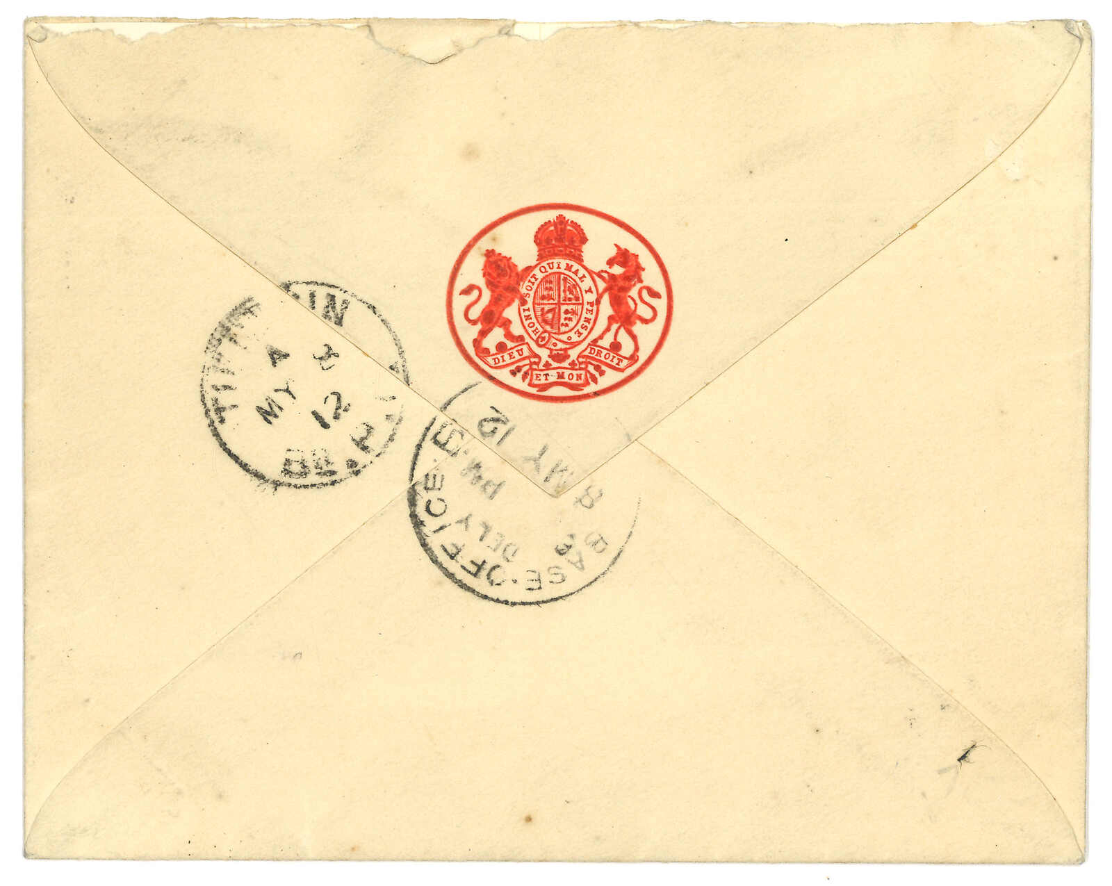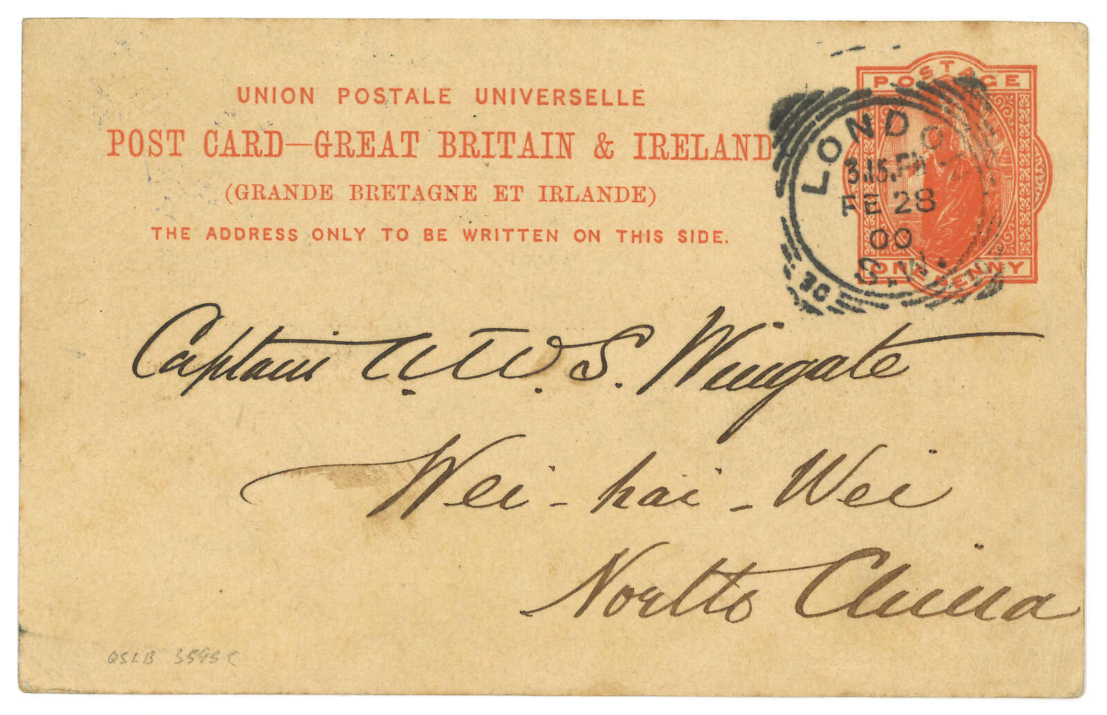1900.2.28 英國寄威海衛。英國1便士郵資片,銷倫敦內圓外方日戳。4.10經香港。4.10抵劉公島,鈐珍罕難得之Webb A型紫色橢圓日戳。Webb記錄中,A型橢圓日戳用作到達戳者僅有四例。(Image 1)