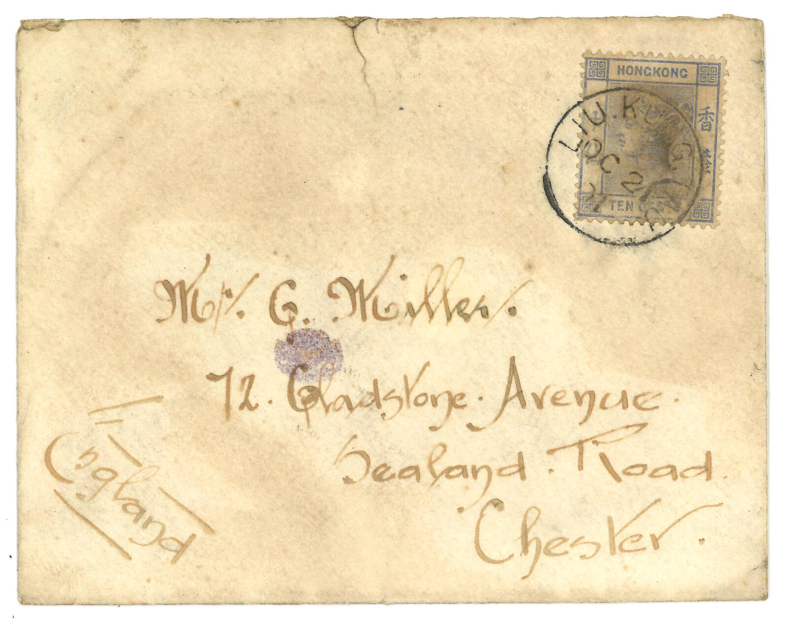 1901 Liu Kung Tau (21 Oct) to England, f.w. Hong Kong QV 10c, tied by Liu Kung Tau BPO Webb type B cds. Transit Hong Kong (30 Oct). Arrived Chester (2 Dec). Early example of the type B cds.