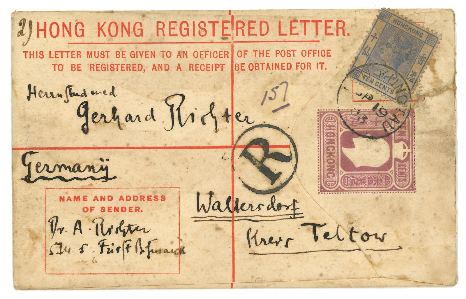 1903.9.19 劉公島寄德國。香港愛德華七世10仙掛號郵資封(size F),加貼維多利亞女皇像10仙,銷劉公局英局Webb B型日戳,旁鈐帶圈R章。9.22經上海英局。10.30抵Wallersdorf。(Image 1)