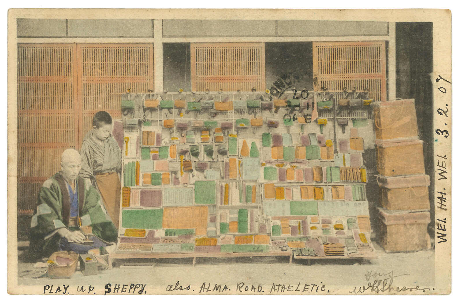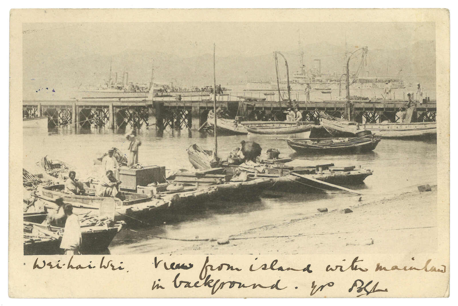 1905.3.10 威海衛寄英國。圖片明信片,貼香港愛德華七世4仙,銷愛德華港英局Webb F型方形日戳。3.13經上海英局。4.20抵倫敦。此片因西伯利亞鐵路關閉而經上海走海路。(Image 1)
