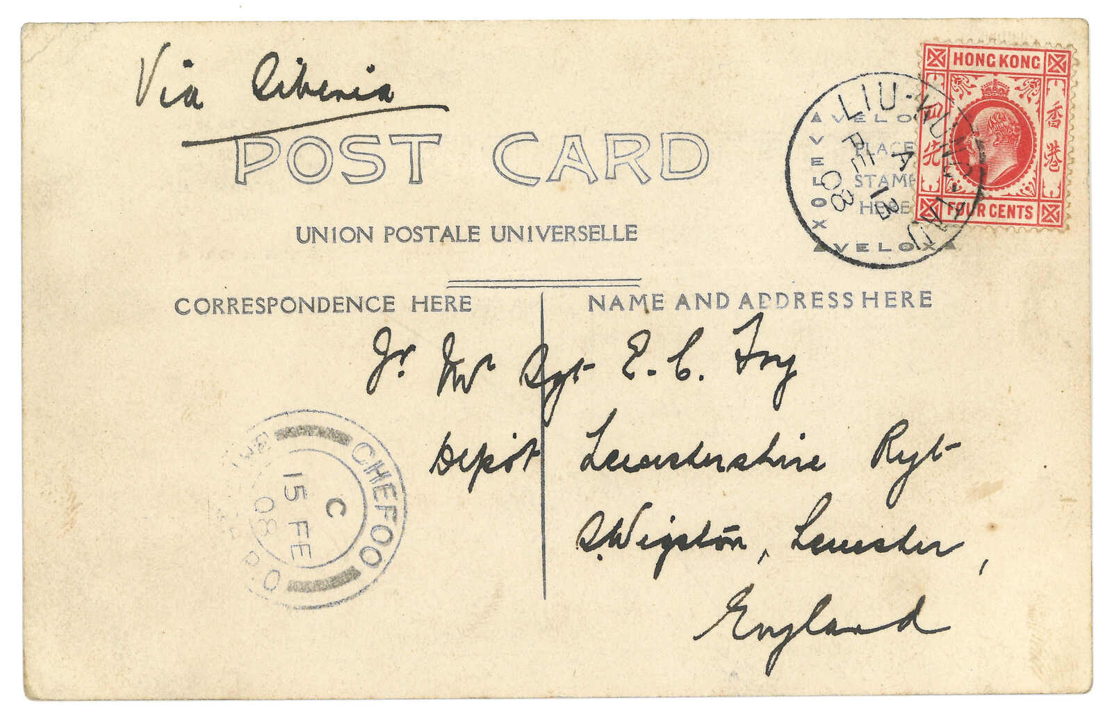 1908.2.13 劉公島寄英國。圖片明信片,貼香港愛德華七世4仙,銷劉公島英局C型日戳。2.15經煙台英局。寫有“Via Siberia”批示。此信經煙台至大連以接駁西伯利亞鐵路。(Image 1)