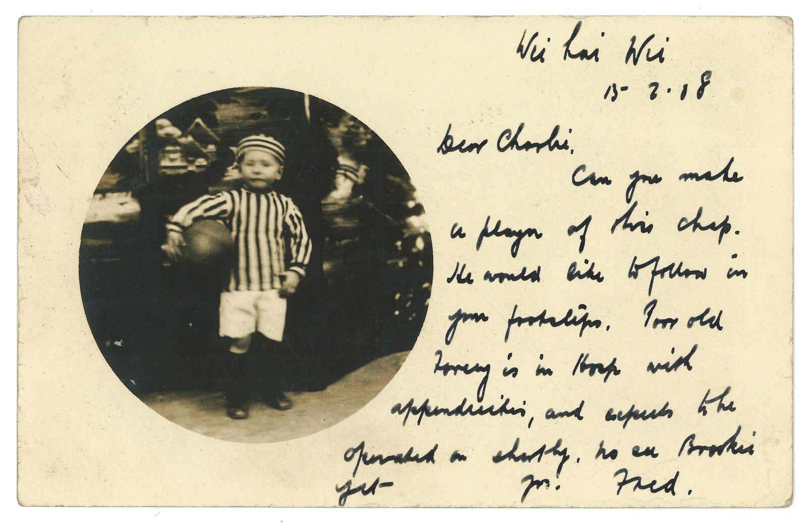 1907.2.4 劉公島寄英國。圖片明信片,貼香港愛德華七世4仙,銷劉公島英局Webb B型A字日戳。2.11經香港。早期之B型日戳並無字母,但在1904年起可見A、B及C字。此戳之單位數年份“7”更是先前未有記錄。(Image 1)