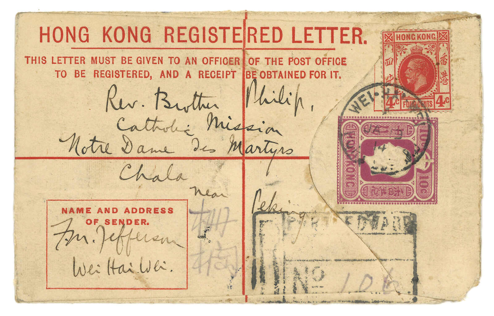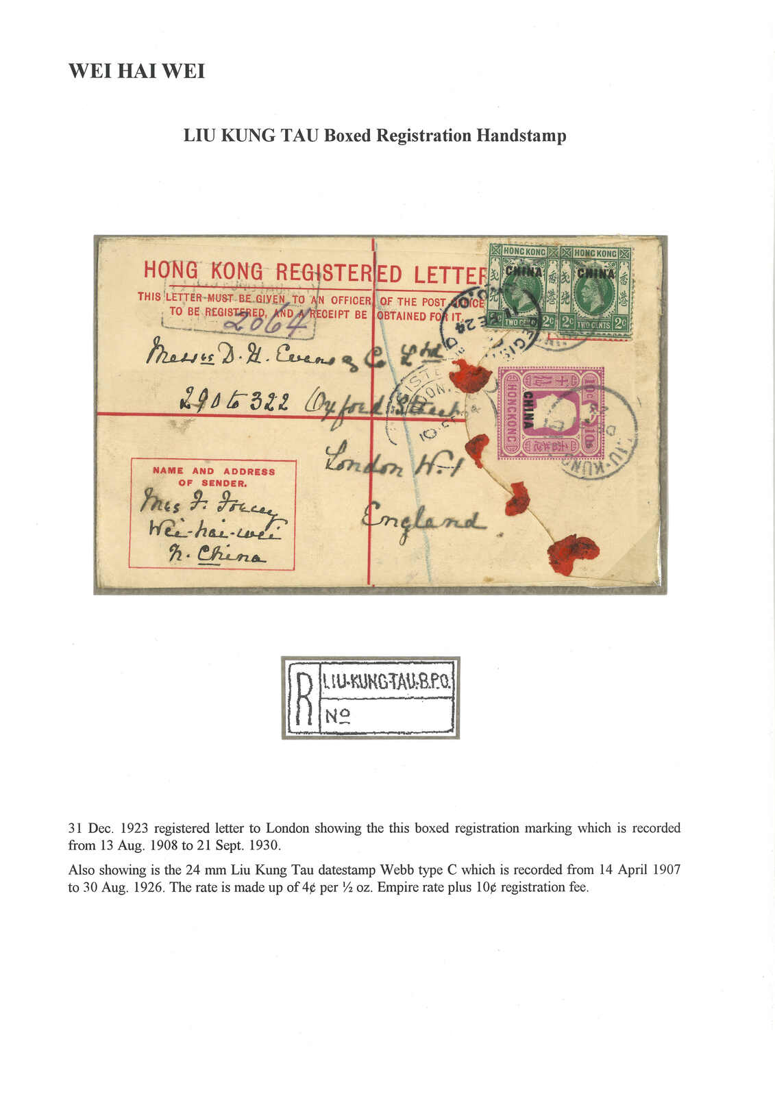 1923.12.31 劉公島寄英國。香港佐治五世加蓋CHINA 10仙掛號郵資封(size G),加貼2仙雙連,銷劉公島英局Webb C型日戳,旁鈐少見之“LIU KUNG TAU B.P.O.”長方形掛號章。2.11抵英國。(Image 1)