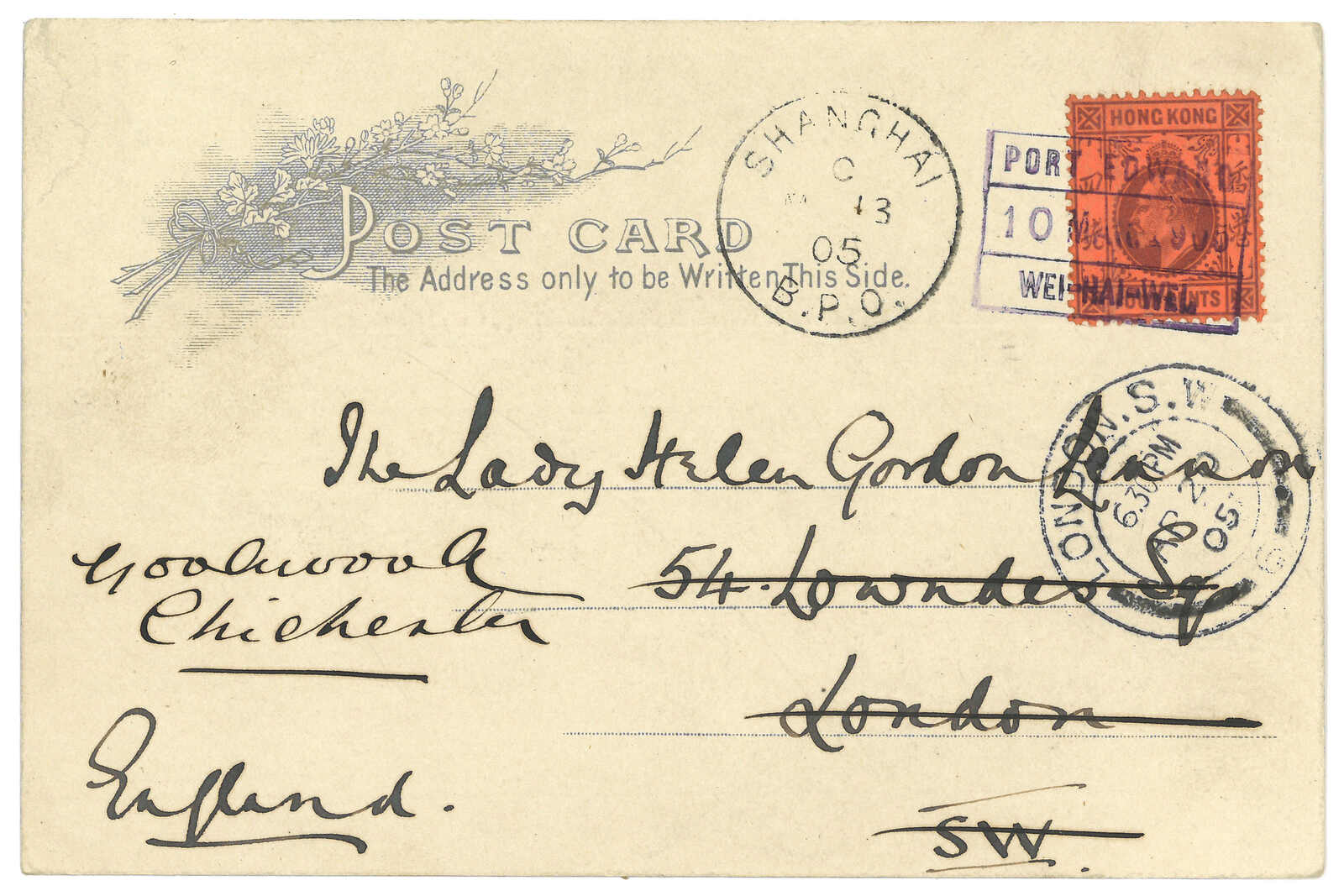 1905 Weihaiwei (10 Mar) to England. Picture postcard, f.w. Hong Kong KEVII 4c, tied by Port Edward BPO Webb type F rectangular d.s. Transit Shanghai BPO (13 Mar) for sea route due to the closure of Trans-Siberian Railway.