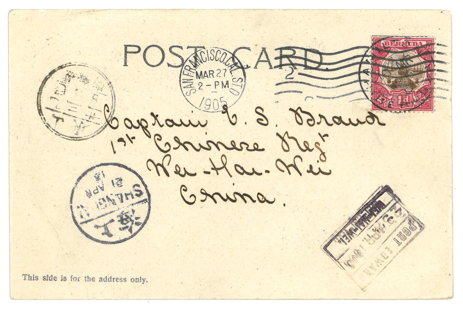1905 Bermuda (27 Mar) to Weihaiwei. Picture postcard, f.w. Bermuda 1d, tied by San Francisco (27 Mar) wavy line d.s. upon transit. Transit Shanghai Chinese PO (21 Apr), Shantung (25 Apr). Arrived Port Edward BPO (25 Apr) with