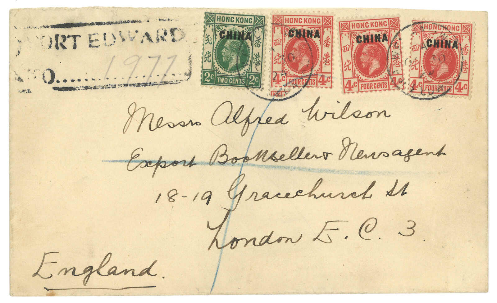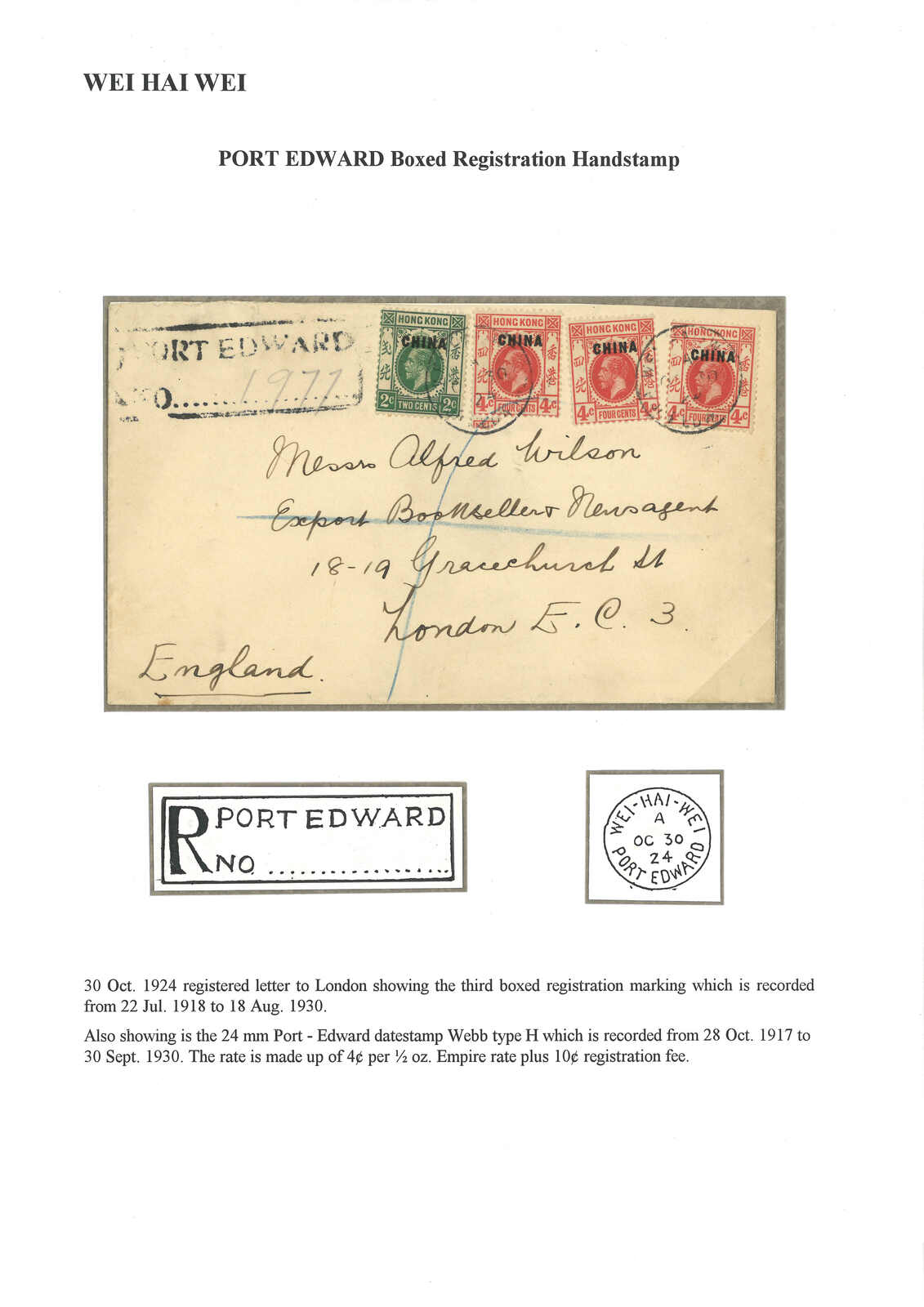 1924.10.30 威海衛寄英國。掛號封,貼香港佐治五世加蓋CHINA 2仙 + 4仙x3,銷威海衛英局Webb H型日戳,旁鈐R3型“PORT EDWARD”長方形掛號章。12.15抵倫敦。(Image 1)