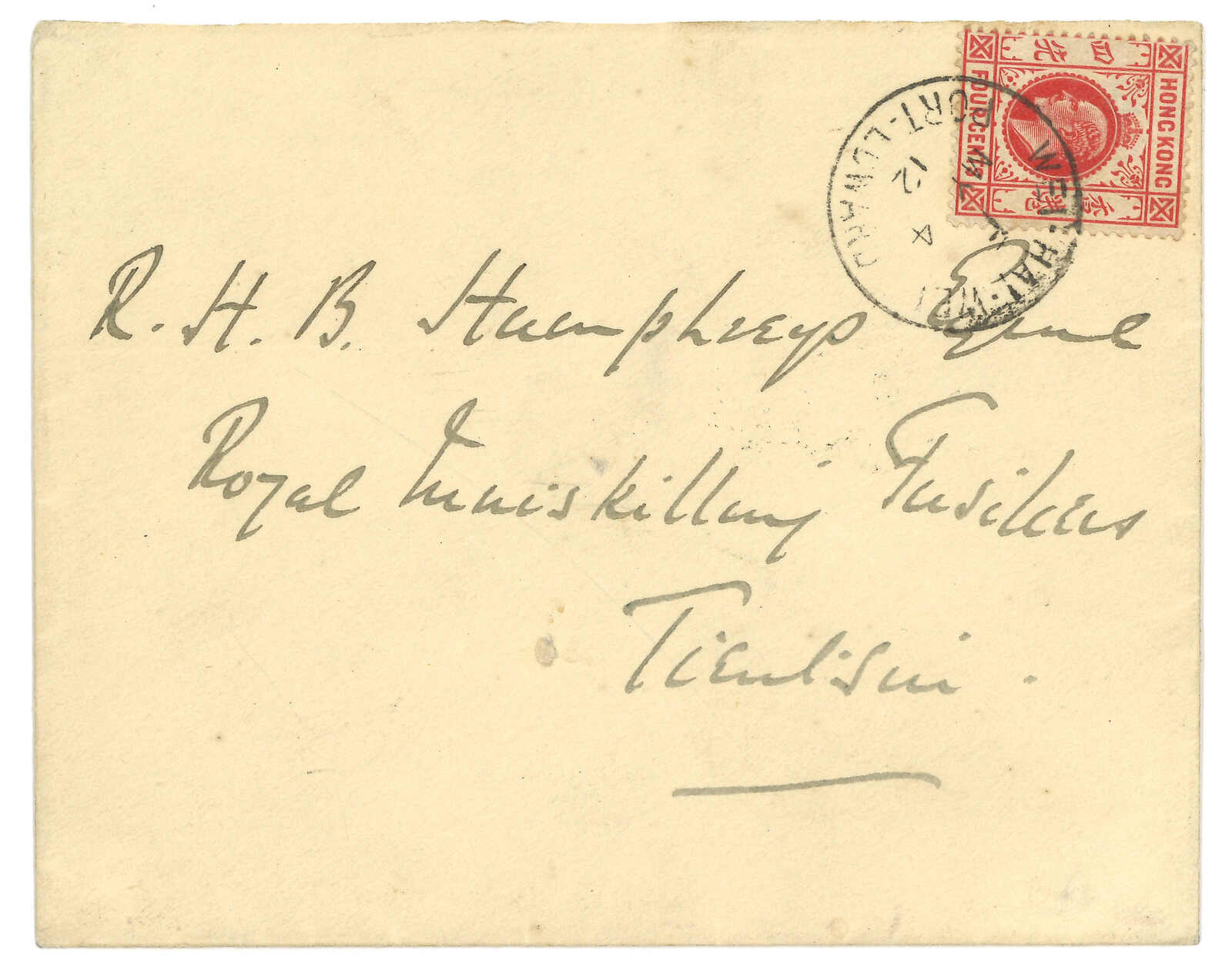 1912 Weihaiwei (4 May) to Tientsin, f.w. Hong Kong KEVII 4c for inter-treaty port rate, tied by Weihaiwei BPO Webb type G cds. Transit Tientsin BPO (8 May). Arrived CEF Base Office (8 May).
