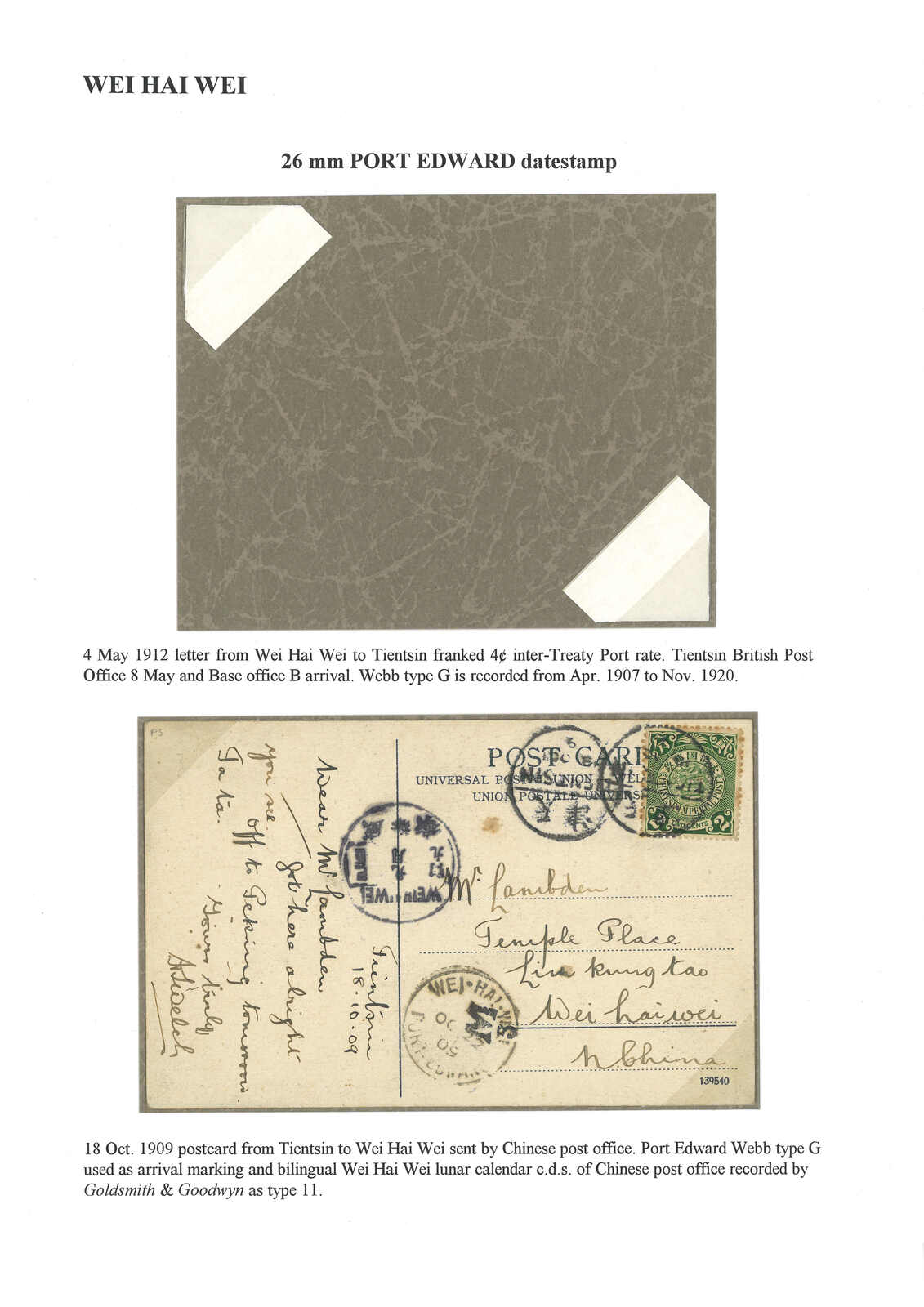 1907.4.22 煙台寄英國。圖片明信片,貼香港愛德華七世4仙,銷極少見之煙台英局Webb B型日戳。Webb記錄中,此戳僅見於四枚舊票上。張文德醫生則記錄有兩件圖片明信片例子,此為兩者中日期最早,兼是唯一一件出口者。(Image 1)