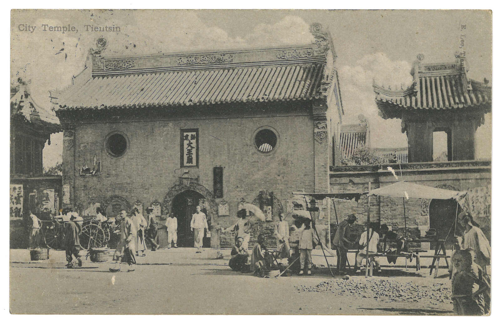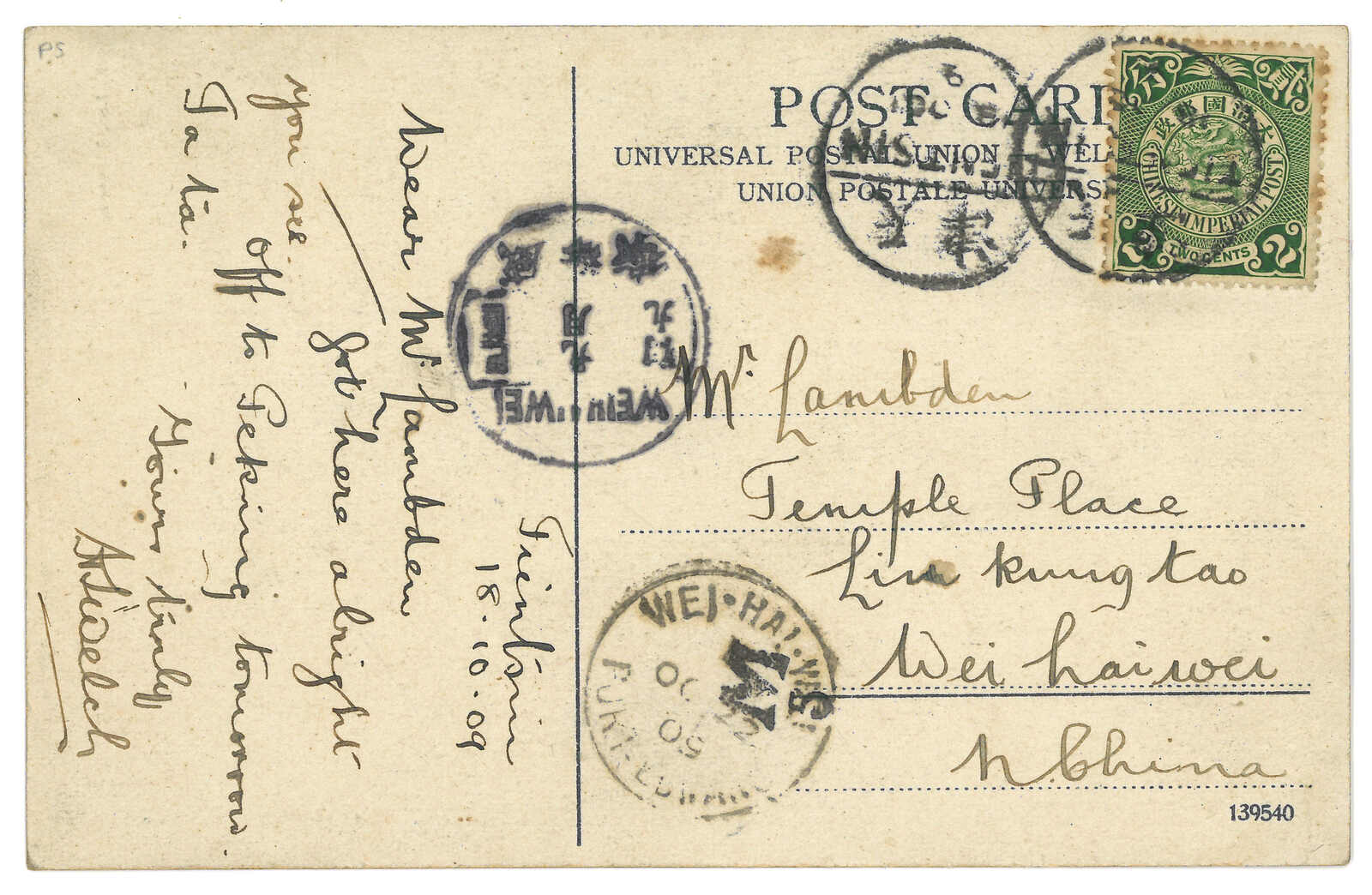 1909.10.18 天津寄威海衛。圖片明信片,貼蟠龍2分,銷天津半切漢英日戳。10.22經威海衛中國郵局,同日交威海衛英局,鈐Webb G型棕色到達戳。(Image 1)