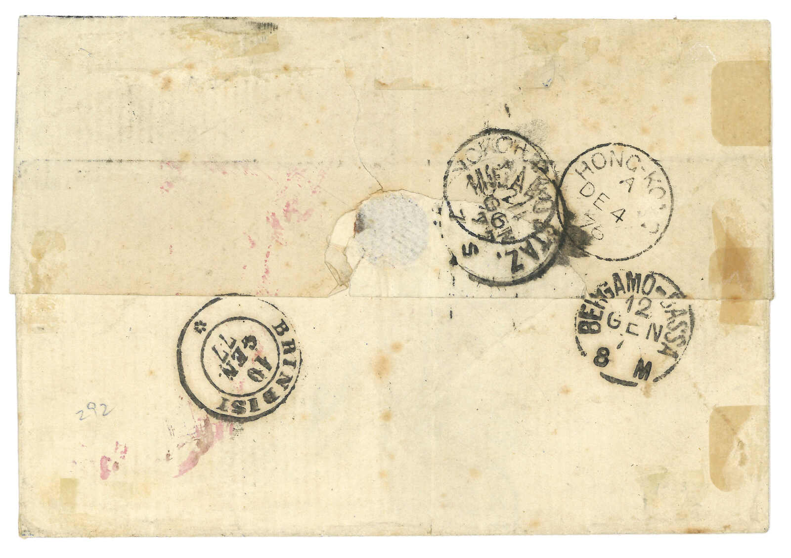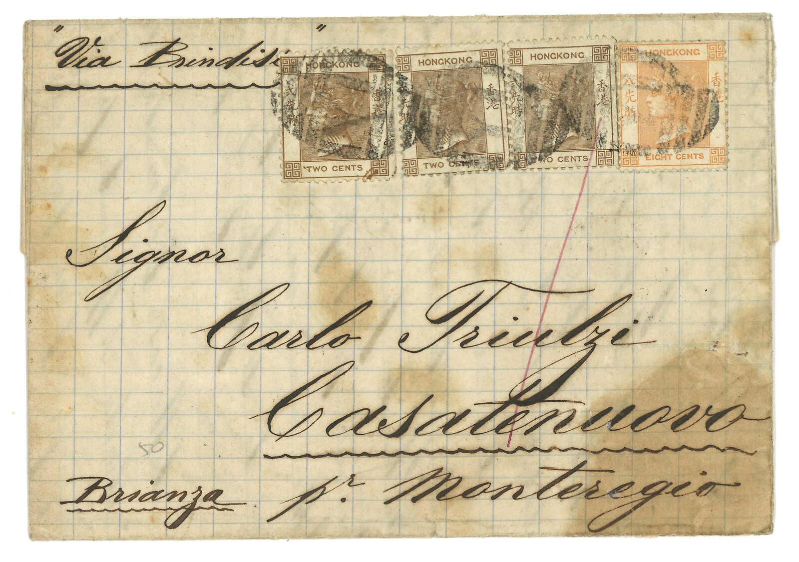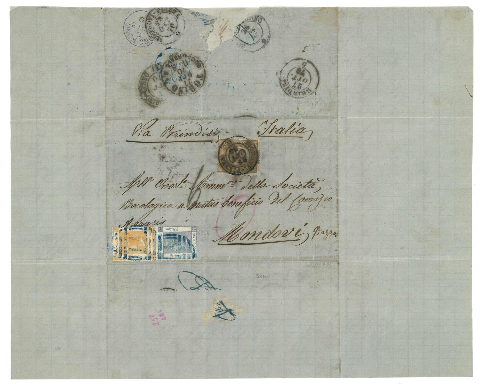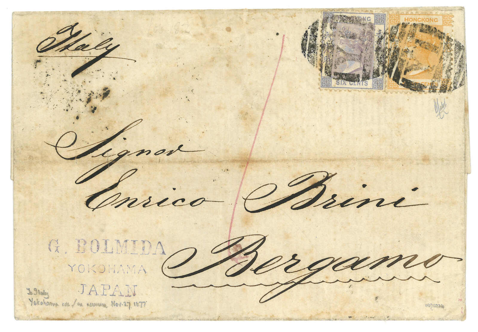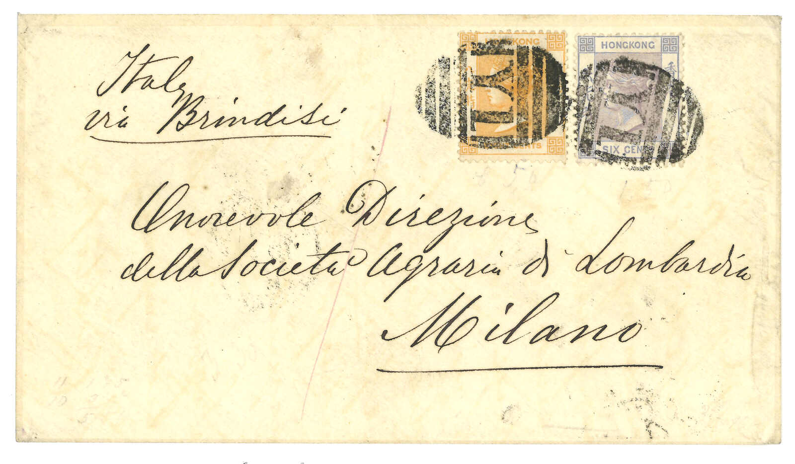 2541 cover image1876 Yokohama (12 Sep) to Italy. Entire letter, sent "via Brindisi", f.w. Hong Kong QV 2c x3 + 8c, tied by Y1 obliterator in blackc, matching with Yokohama BPO cds on reverse. Transit Hong Kong (29 Sep), Milan (3 Nov). Arrived Casatenovo (4 Nov).