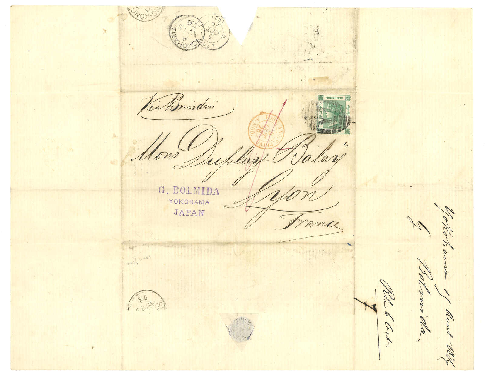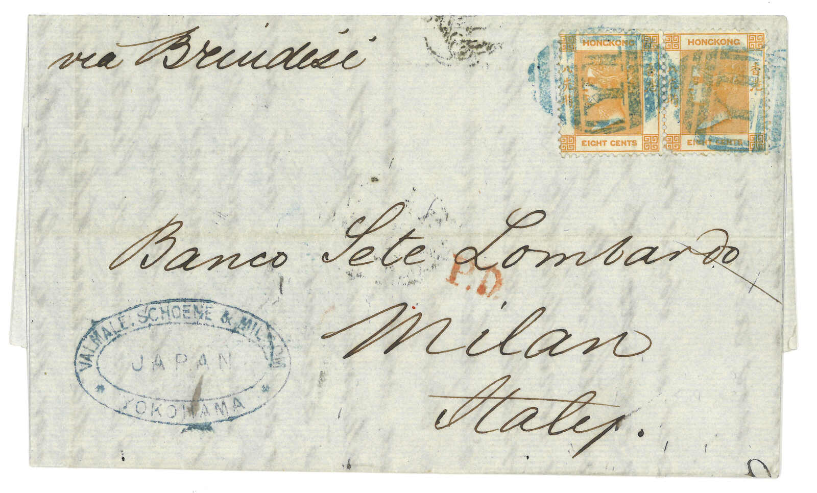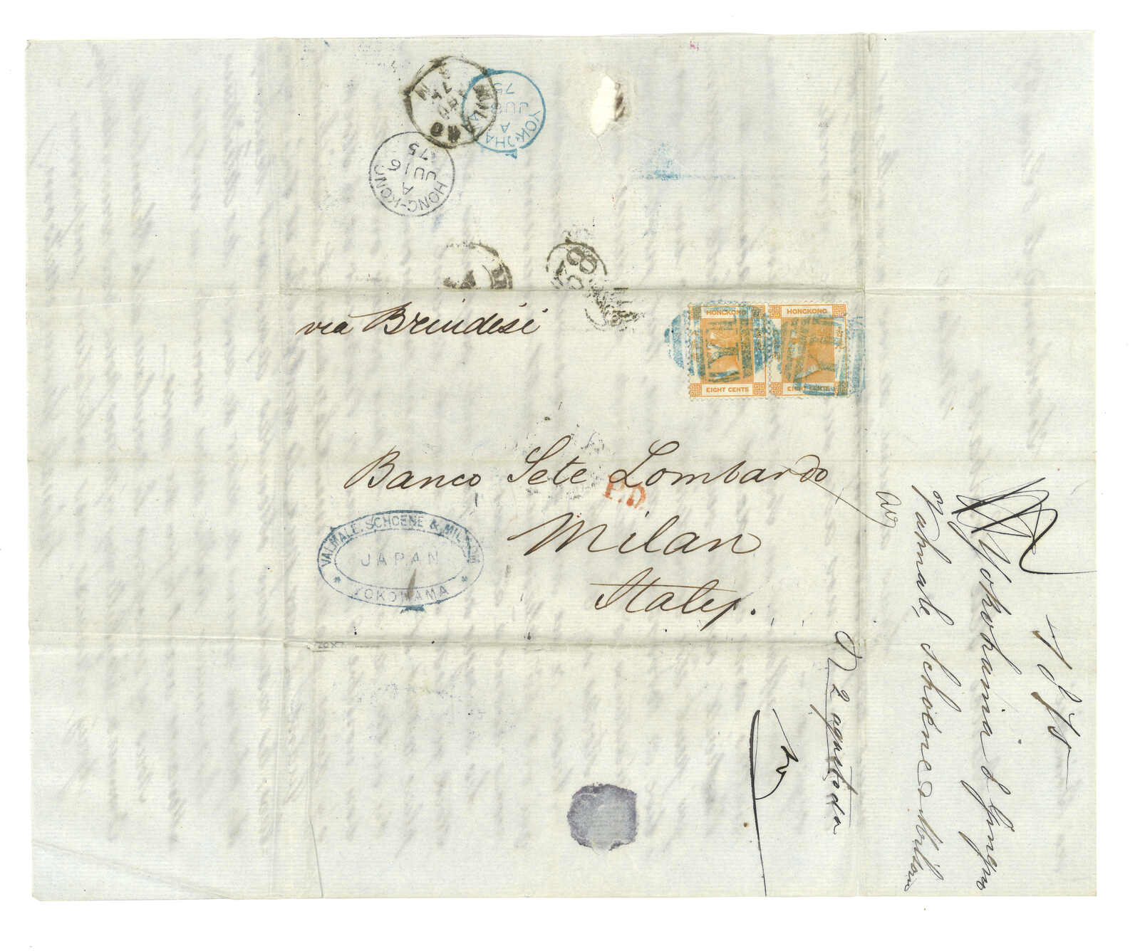 2538 cover image1875 Yokohama (8 Jun) to Italy. Entire letter, sent "via Brindisi", f.w. Hong Kong QV 8c in pair, tied by Y1 obliterator in violet, alongside with "Valmale, Schoene & Mil" oval seal. On reverse with Yokohama BPO cds. Transit Hong Kong (16 Jun). Arrived Milan (Aug).