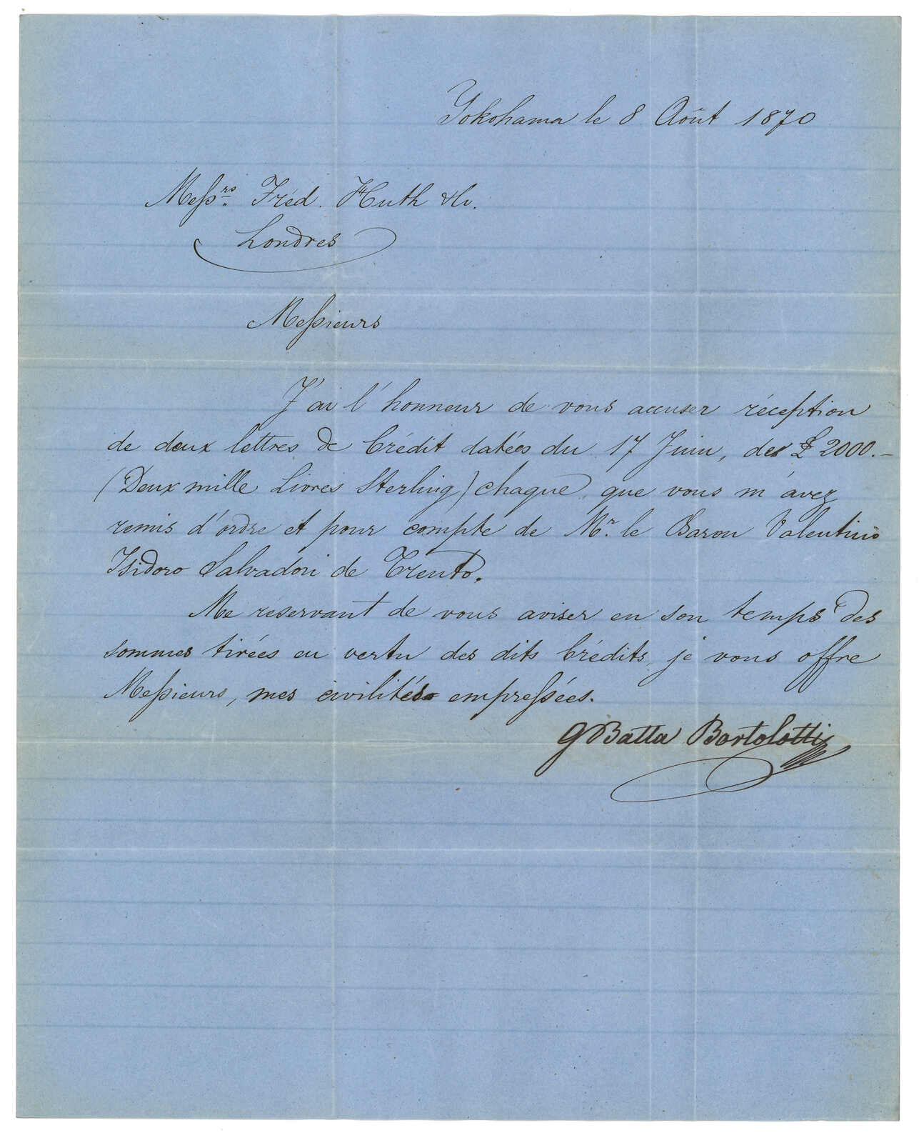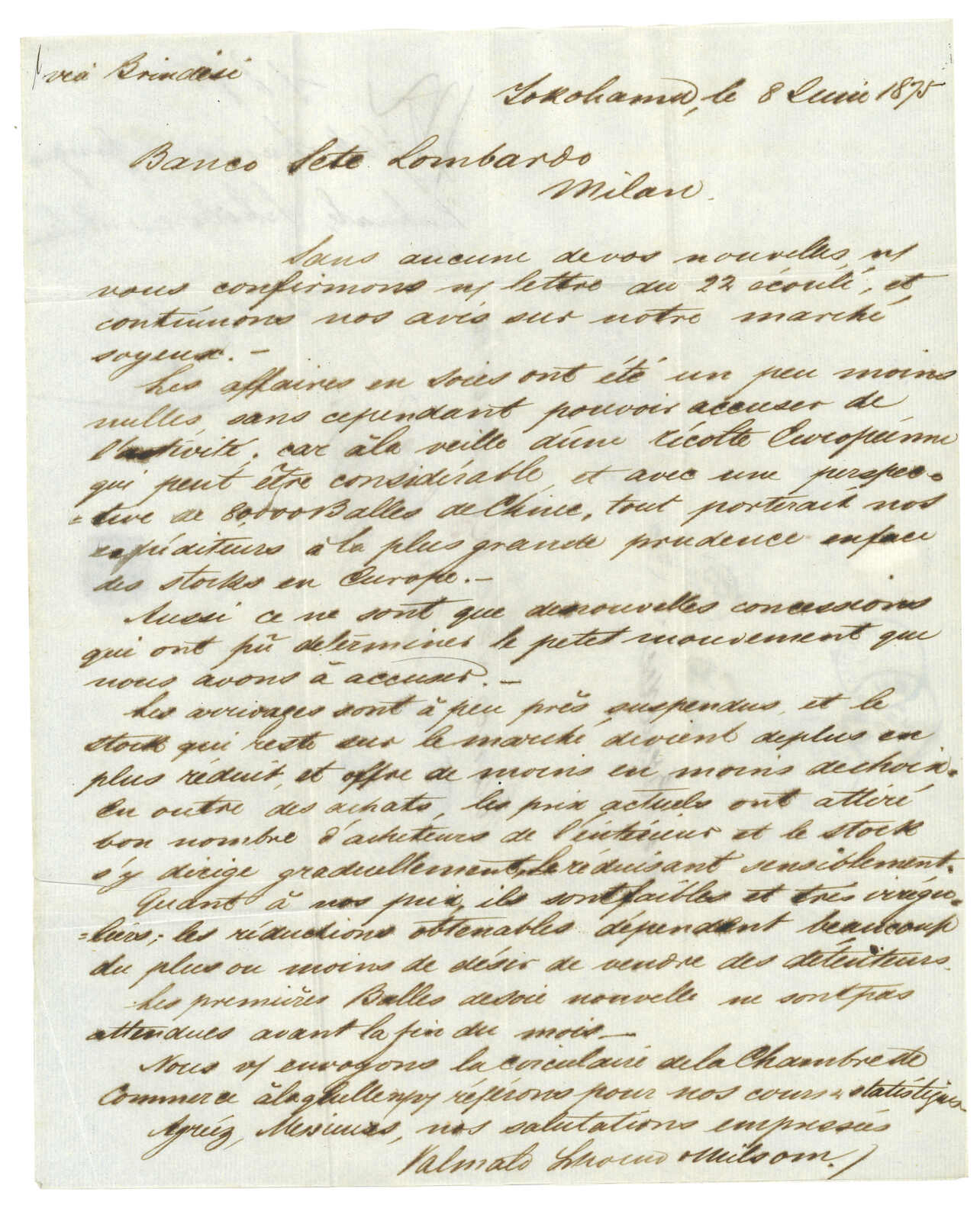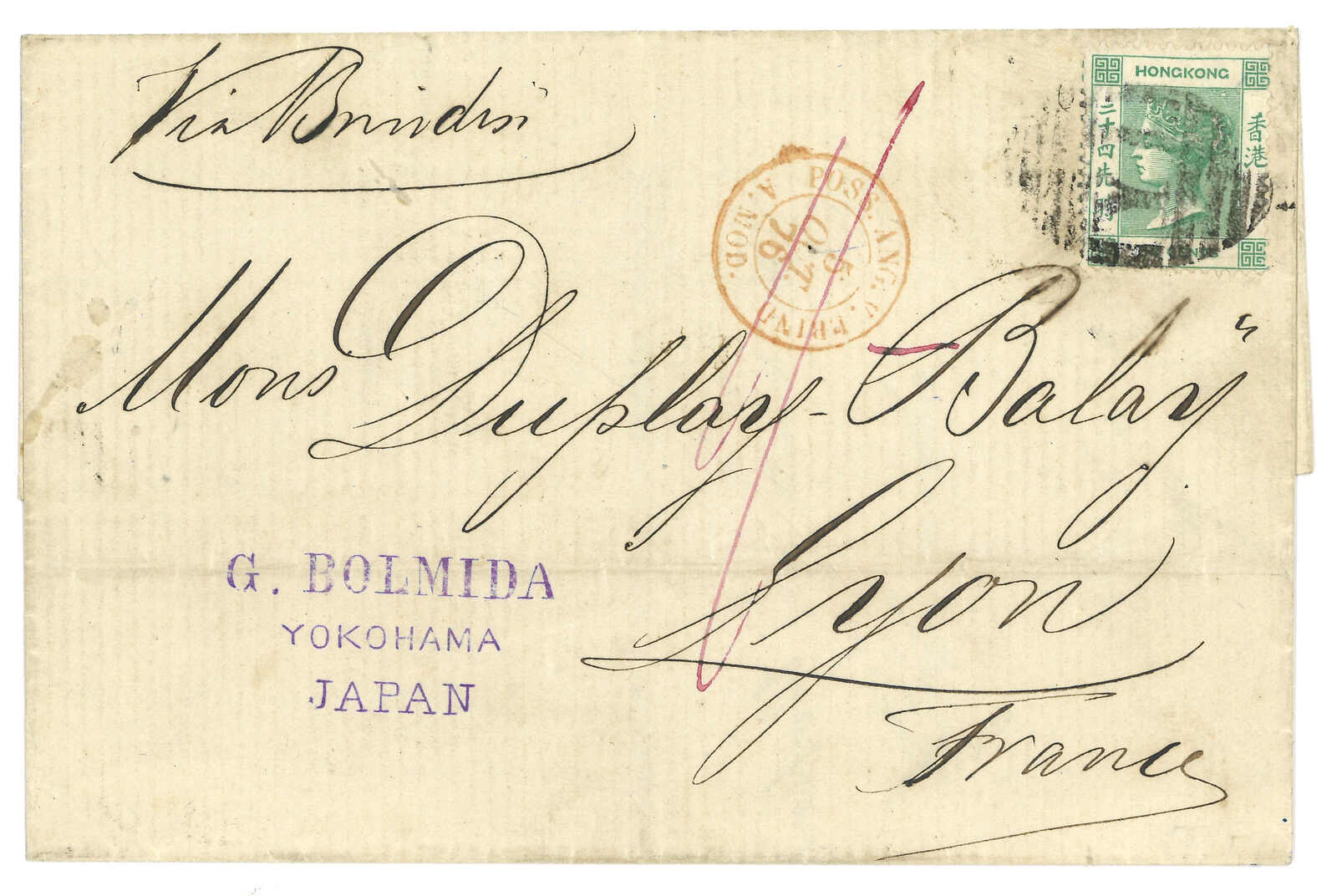 2538 cover image1875 Yokohama (8 Jun) to Italy. Entire letter, sent "via Brindisi", f.w. Hong Kong QV 8c in pair, tied by Y1 obliterator in violet, alongside with "Valmale, Schoene & Mil" oval seal. On reverse with Yokohama BPO cds. Transit Hong Kong (16 Jun). Arrived Milan (Aug).