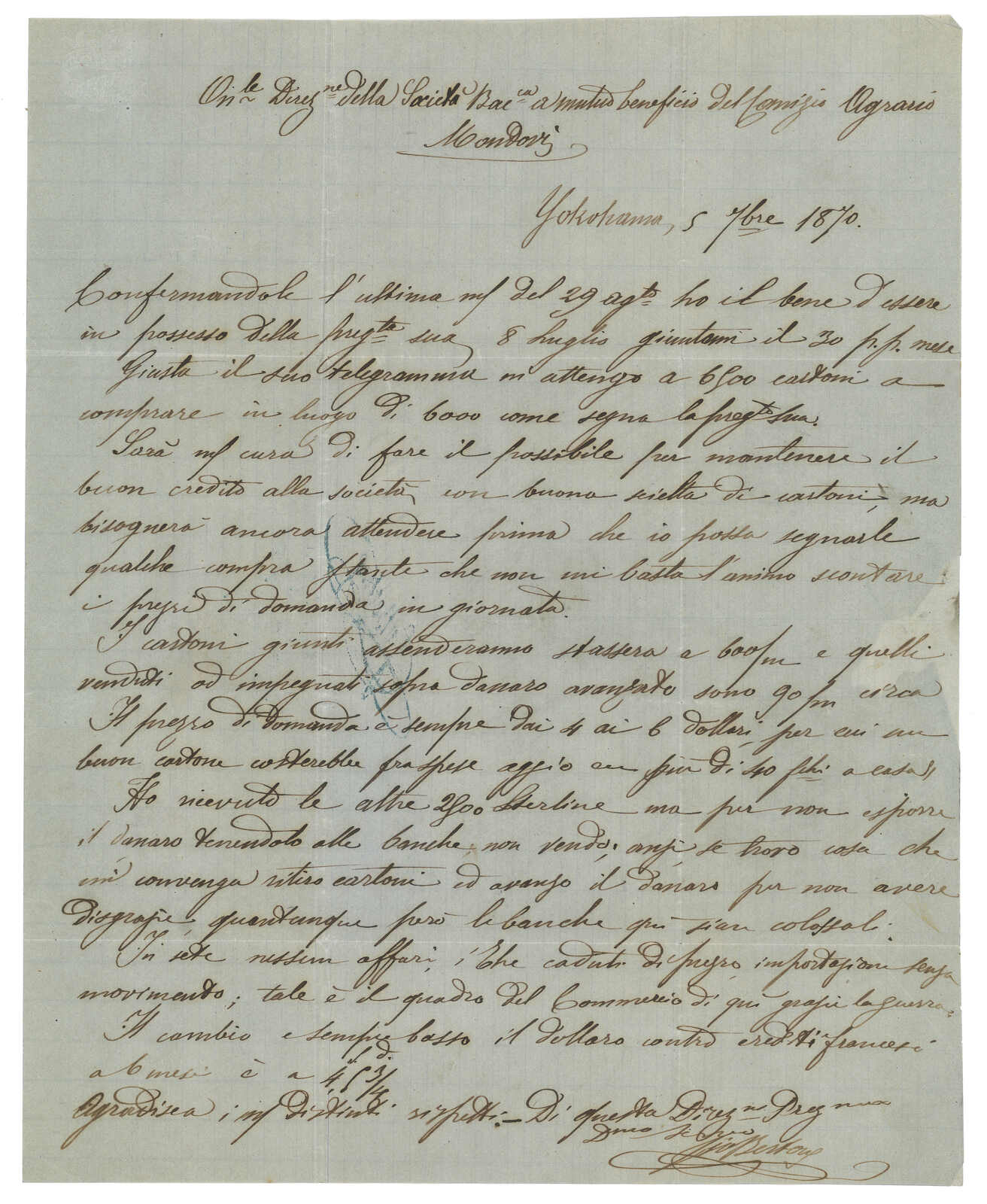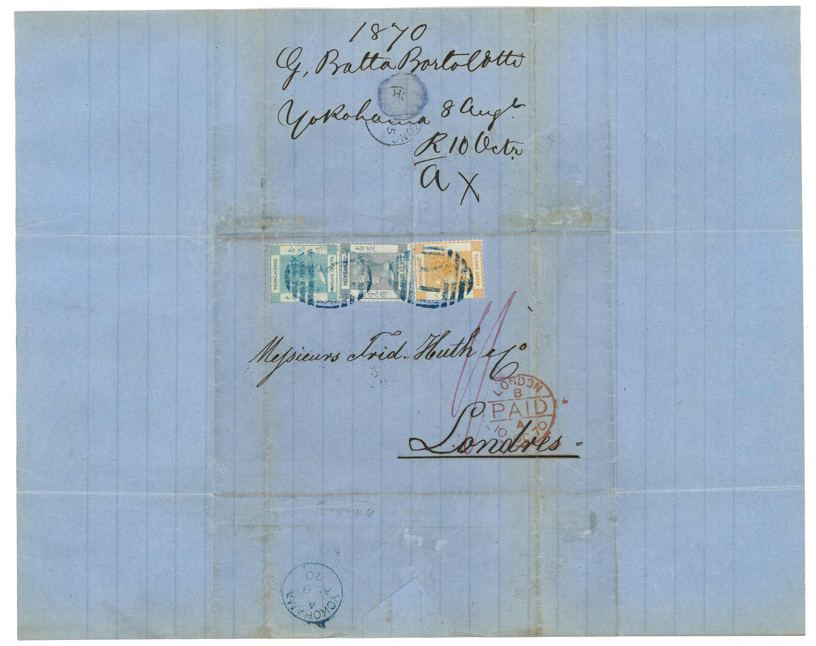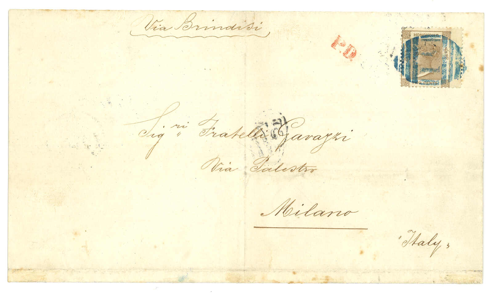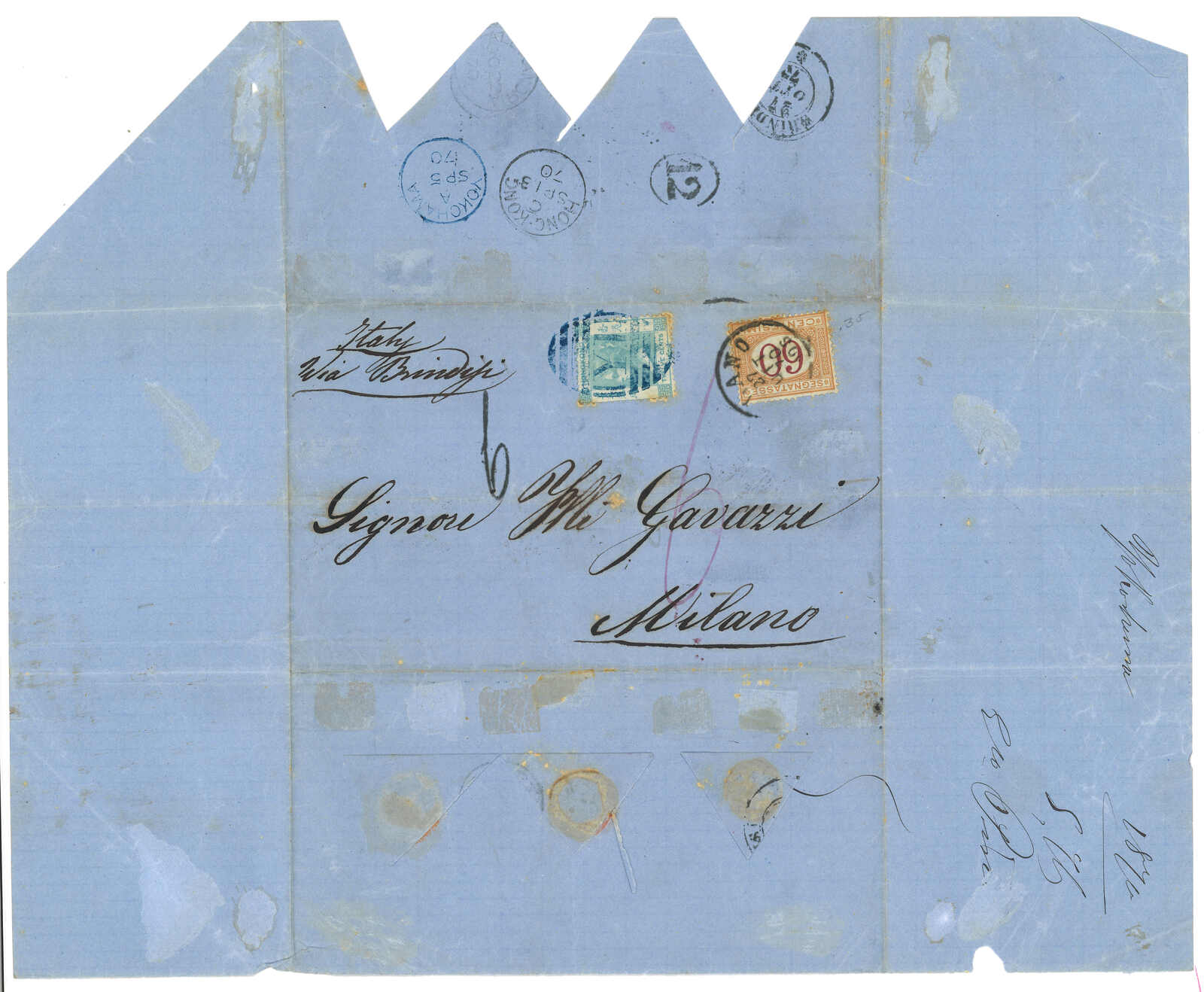 2528 cover image1870 Yokohama (5 Sep) to Italy. Entire letter, sent "via Brindisi" and rated "6", f.w. Hong Kong QV 12c, tied by Y1 obliterator in violet, matching with Yokohama BPO cds on reverse. Transit Hong Kong (13 Sep), Alexandria (22 Oct), Brindisi (27 Oct). As 12c was only to Alexandria, thus in combination with Italian postage due 60c for onward carriage paid on receipt in Italy, tied by Milan (27 Oct) cds.