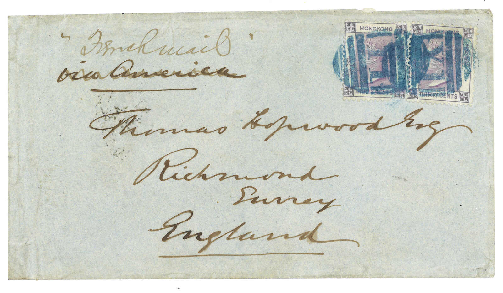 2537 cover image1875 Yokohama (4 May) to England, f.w. Hong Kong QV 30c x2, tied by Y1 obliterator in violet, matching with Yokohama BPO cds on reverse. Showing "via America" annotation but crossed out to be "French mail". Transit Hong Kong (12 May). Double rate example. Arrived Richmond (24 Jun). Ex- George E Burghard. 1980 (4 Dec) Sotheby Parke Pernet, The Ryohei Ishikawa Collection, lot 645.