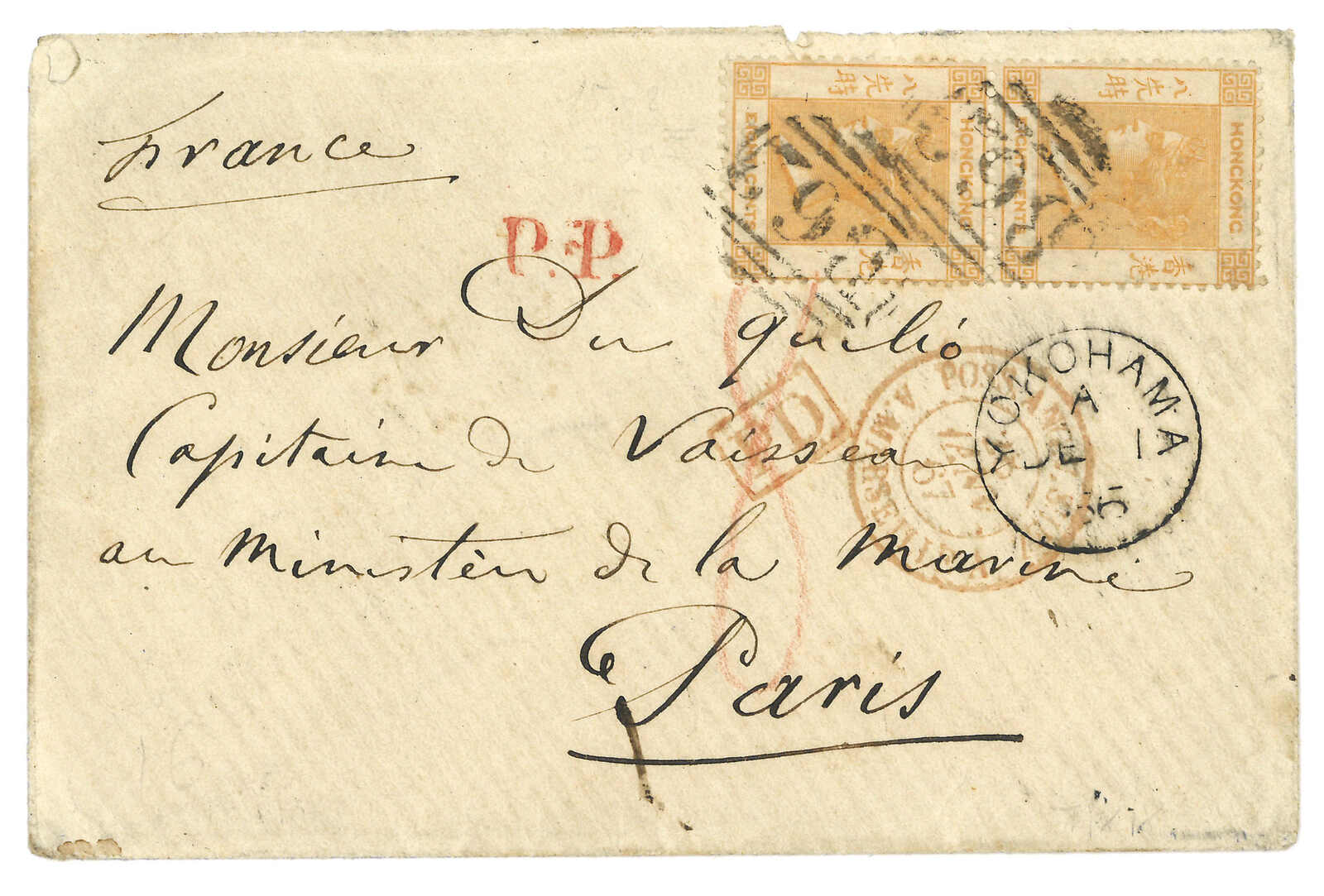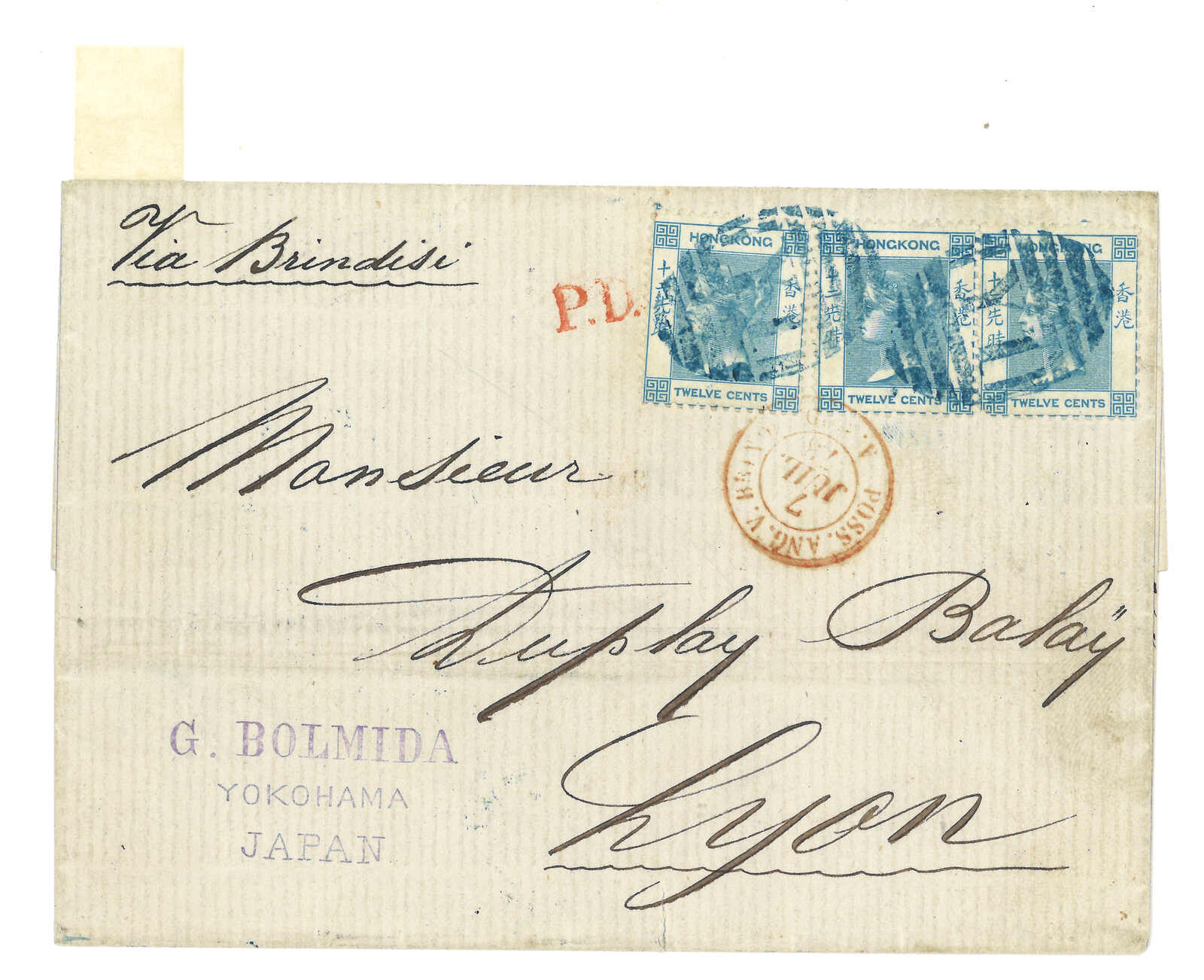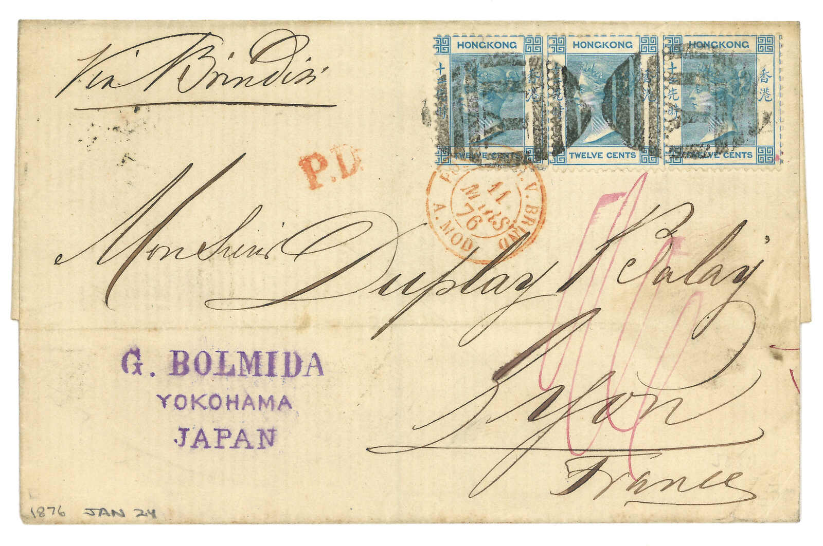1876.1.24 橫濱經布林迪西寄法國,貼香港維多利亞女皇像12仙橫三連,帶齒孔移位變異,銷Y1黑色殺手戳,另鈐橫濱英局始發日戳。正蓋有PD章。1.31經香港。3.11抵里昂。(Image 1) (Image 2)