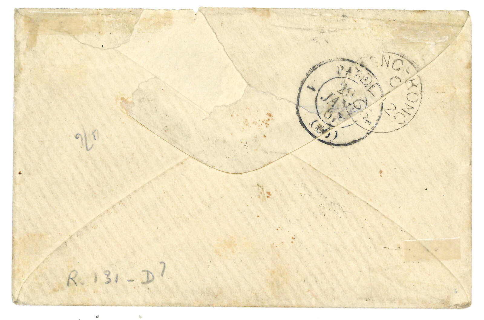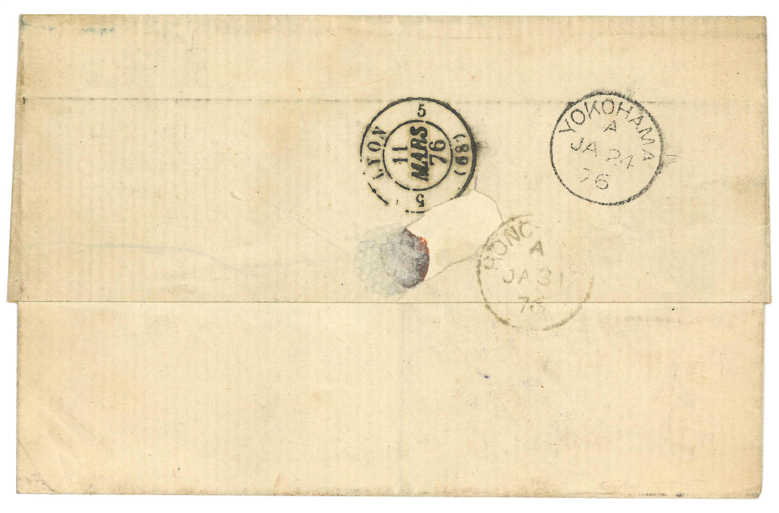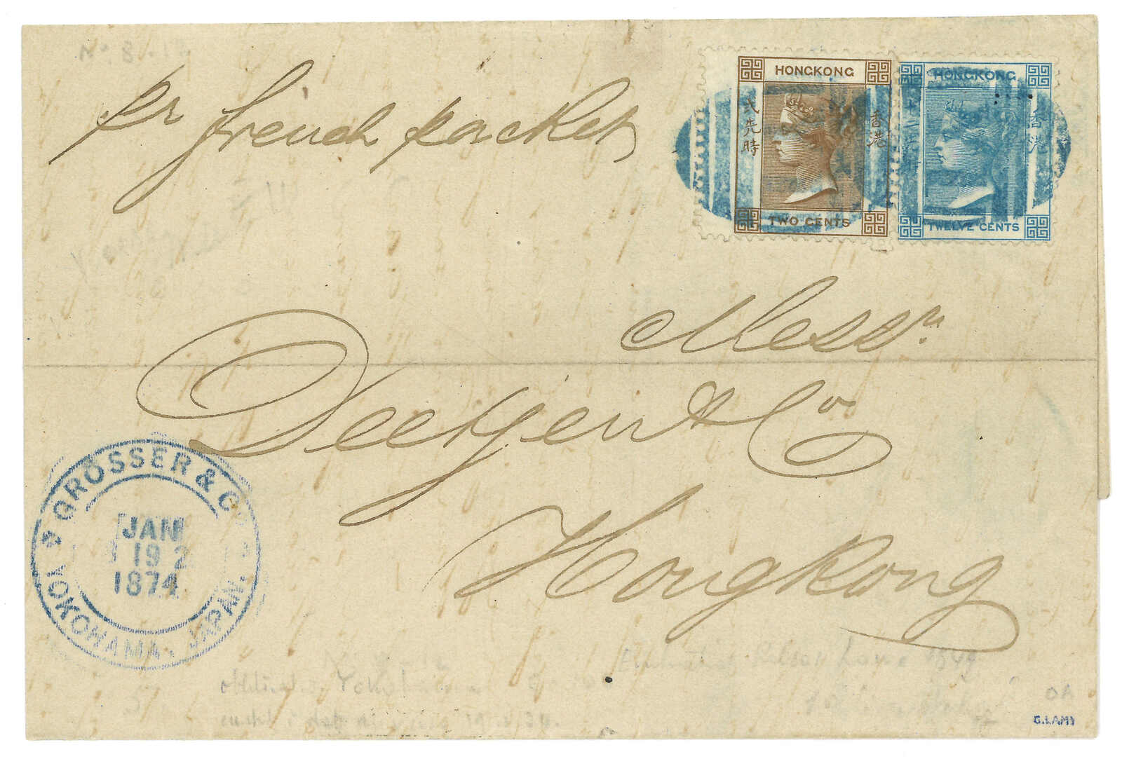 2535 cover image1874 Yokohama (19 Jan) to Hong Kong via French packet. Entire letter, f.w. Hong Kong QV 2c + 12c, tied by Y1 obliterator in blue, matching with Yokohama BPO origin cds and "Grosser & Co" cds. Arrived Hong Kong (27 Jan).