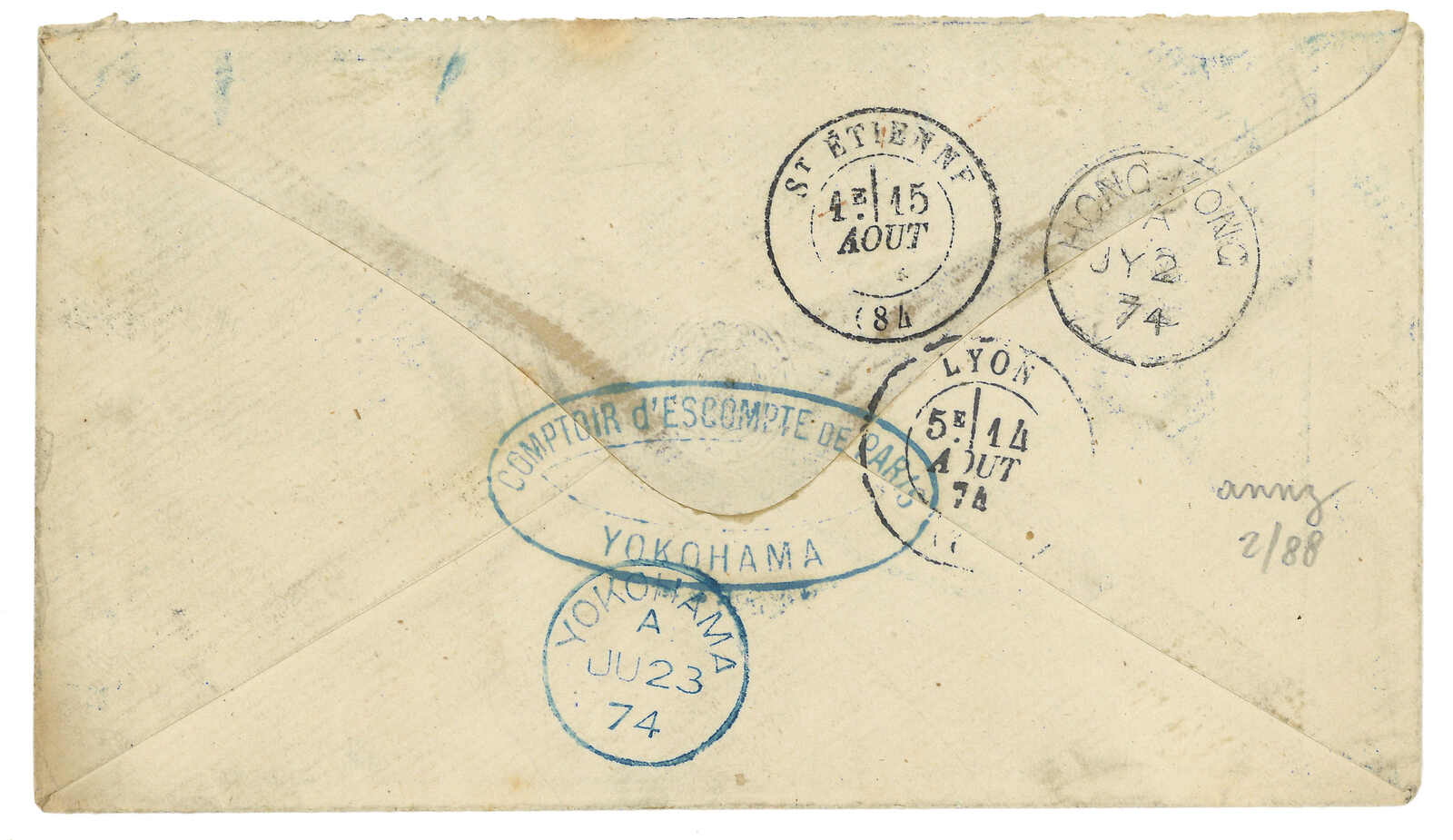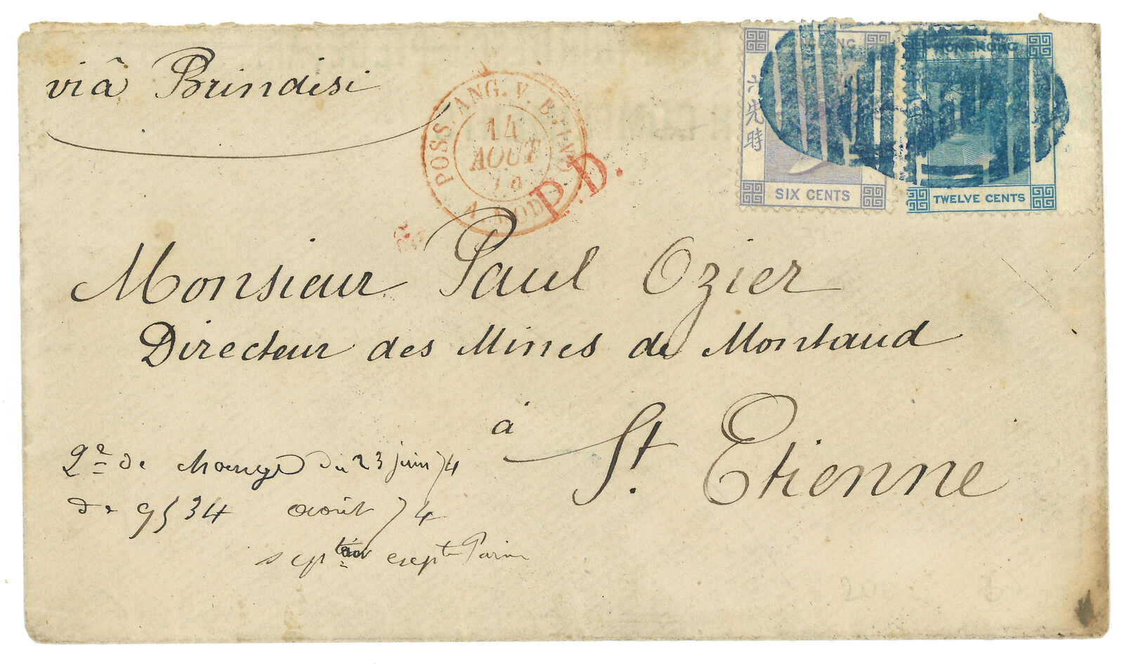 1874.6.23 橫濱經布林迪西寄法國,貼香港維多利亞女皇像6仙 + 12仙,銷Y1藍色殺手戳,另鈐橫濱英局A字紫色日戳及“Comptoir d'Escompte de Paris”橢圓形戳記。正蓋有PD章。7.2經香港。8.15抵St. Etienne。(Image 1) (Image 2)