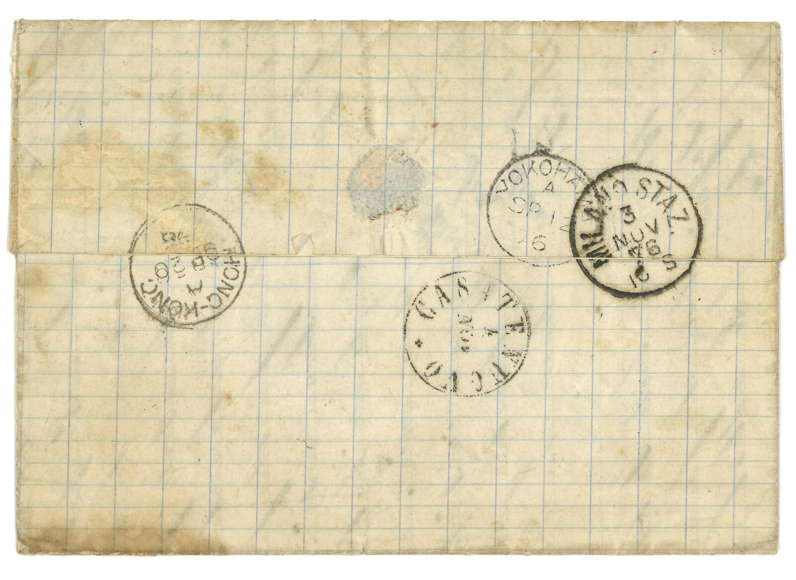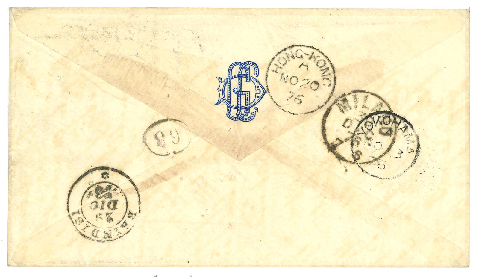 1876.11.3 橫濱經布林迪西寄意大利,貼香港維多利亞女皇像8仙 + 6仙,銷Y1黑色殺手戳,背面蓋有橫濱英局日戳。11.20經香港,11.29經布林迪西。12.30抵米蘭。(Image 1) (Image 2)