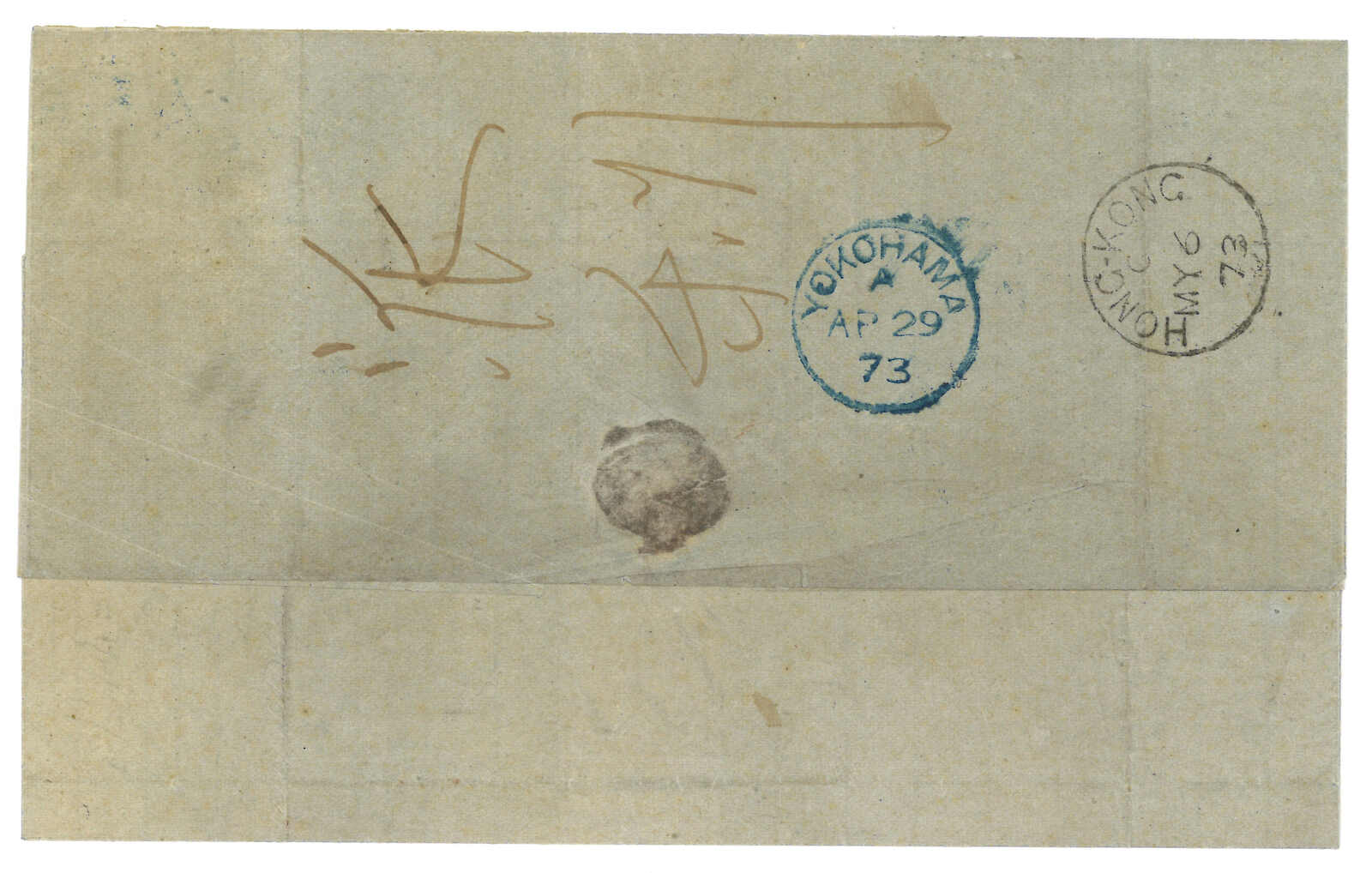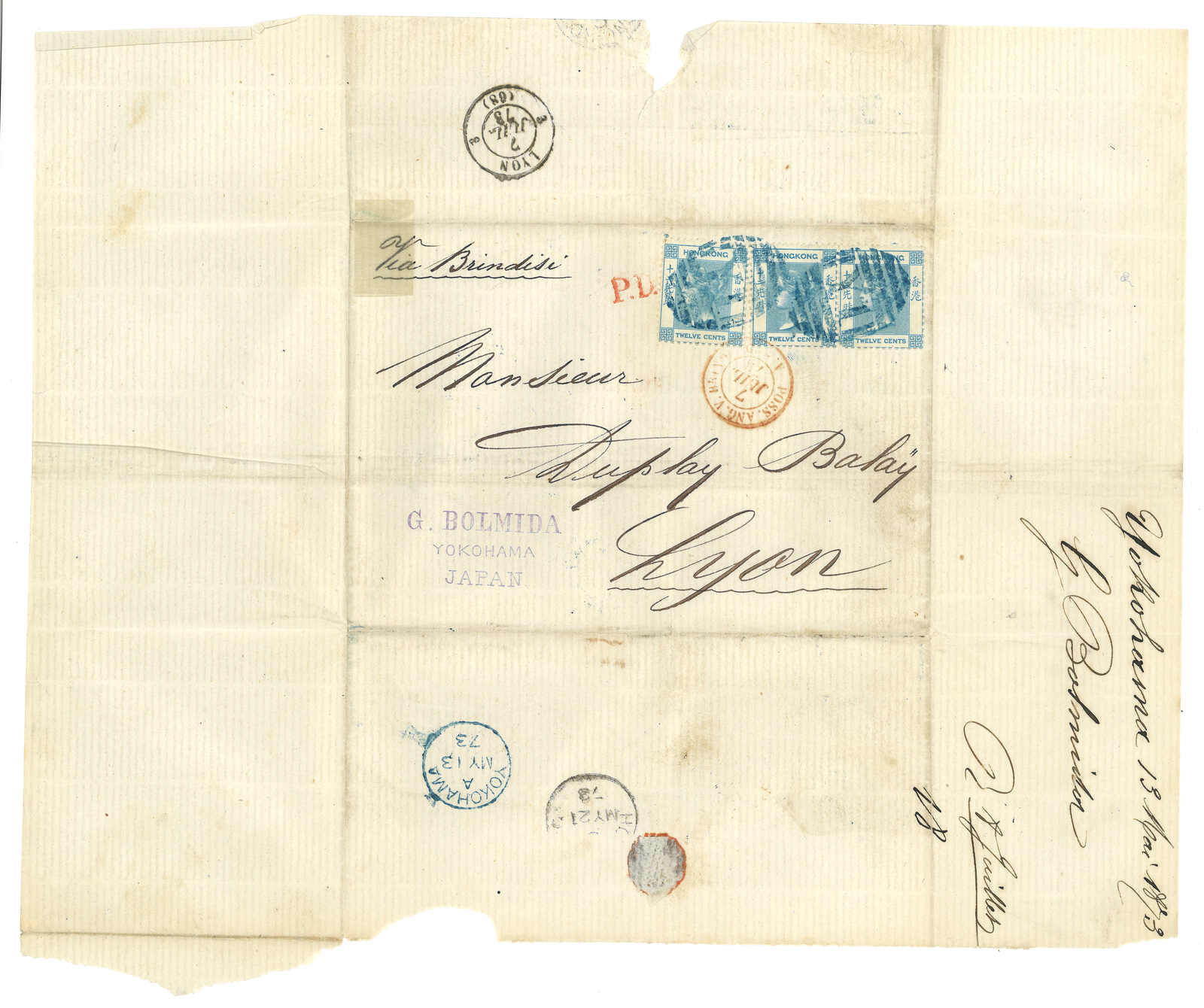 1873.5.13 橫濱經布林迪西寄法國,貼香港維多利亞女皇像12仙x3,銷Y1藍色殺手戳,另鈐橫濱英局日戳。正蓋有PD章。5.21經香港。7.2抵里昂。(Image 1) (Image 2)