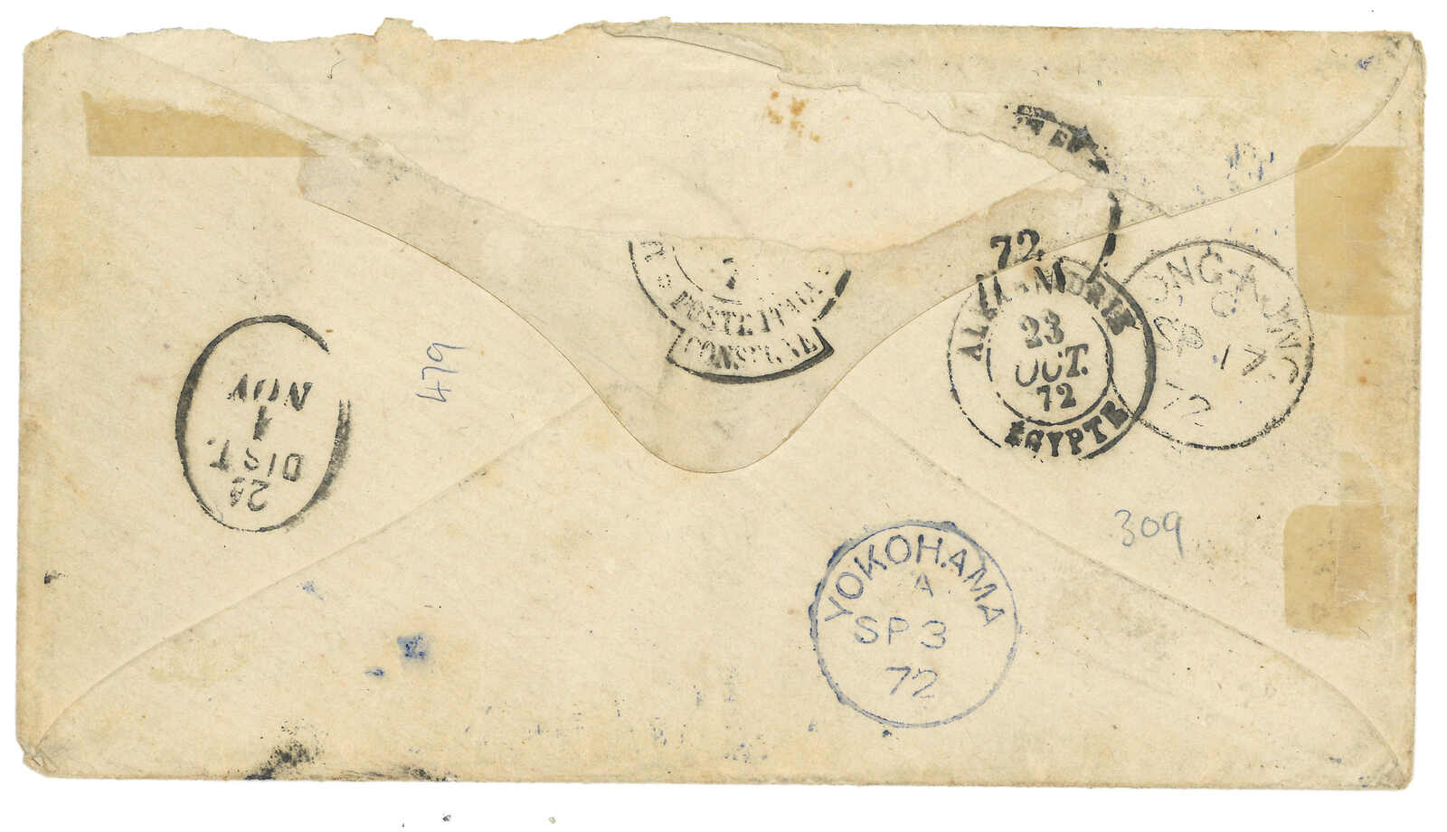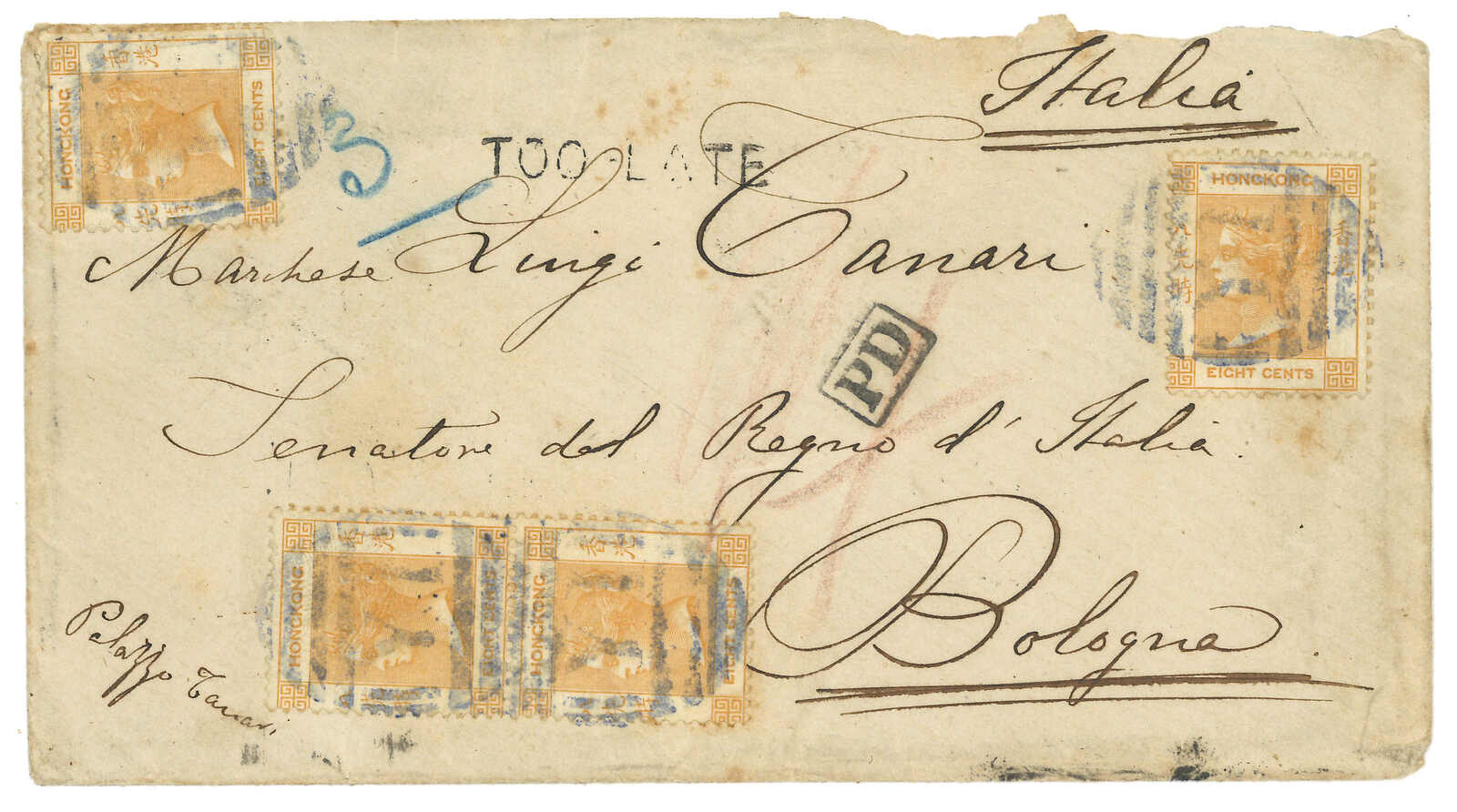 1872.9.3 橫濱寄意大利,貼香港維多利亞女皇像8仙x4,銷Y1紫色殺手戳,旁鈐橫濱英局始發紫色日戳。9.17經香港,另見“TOO LATE”橫戳,顯示在香港未及趕班。10.23經亞歷山大港。抵博洛尼亞。封舌缺失。Webb《Hong Kong and the Treaty Ports of China and Japan》Plate 55原件。(Image 1) (Image 2)