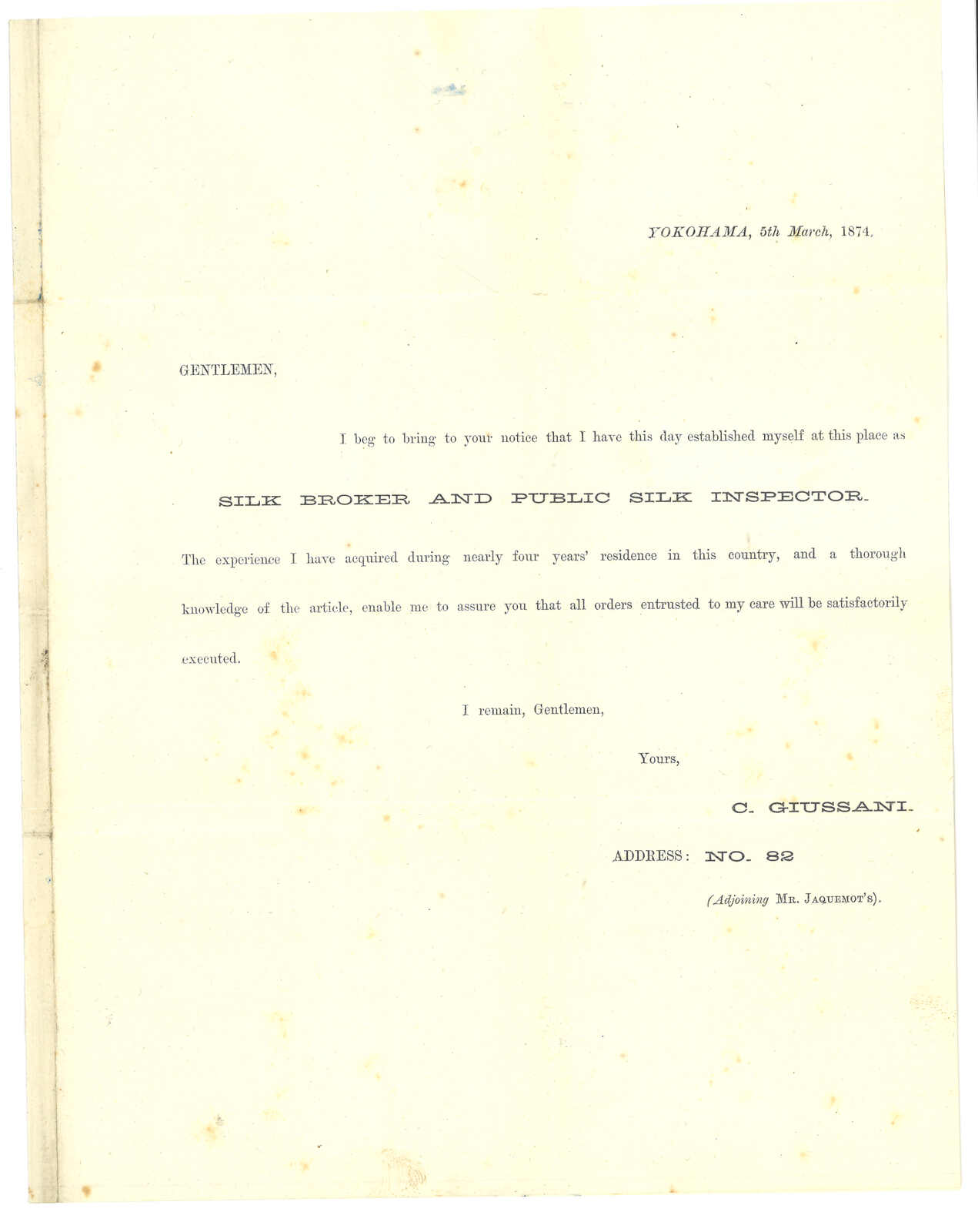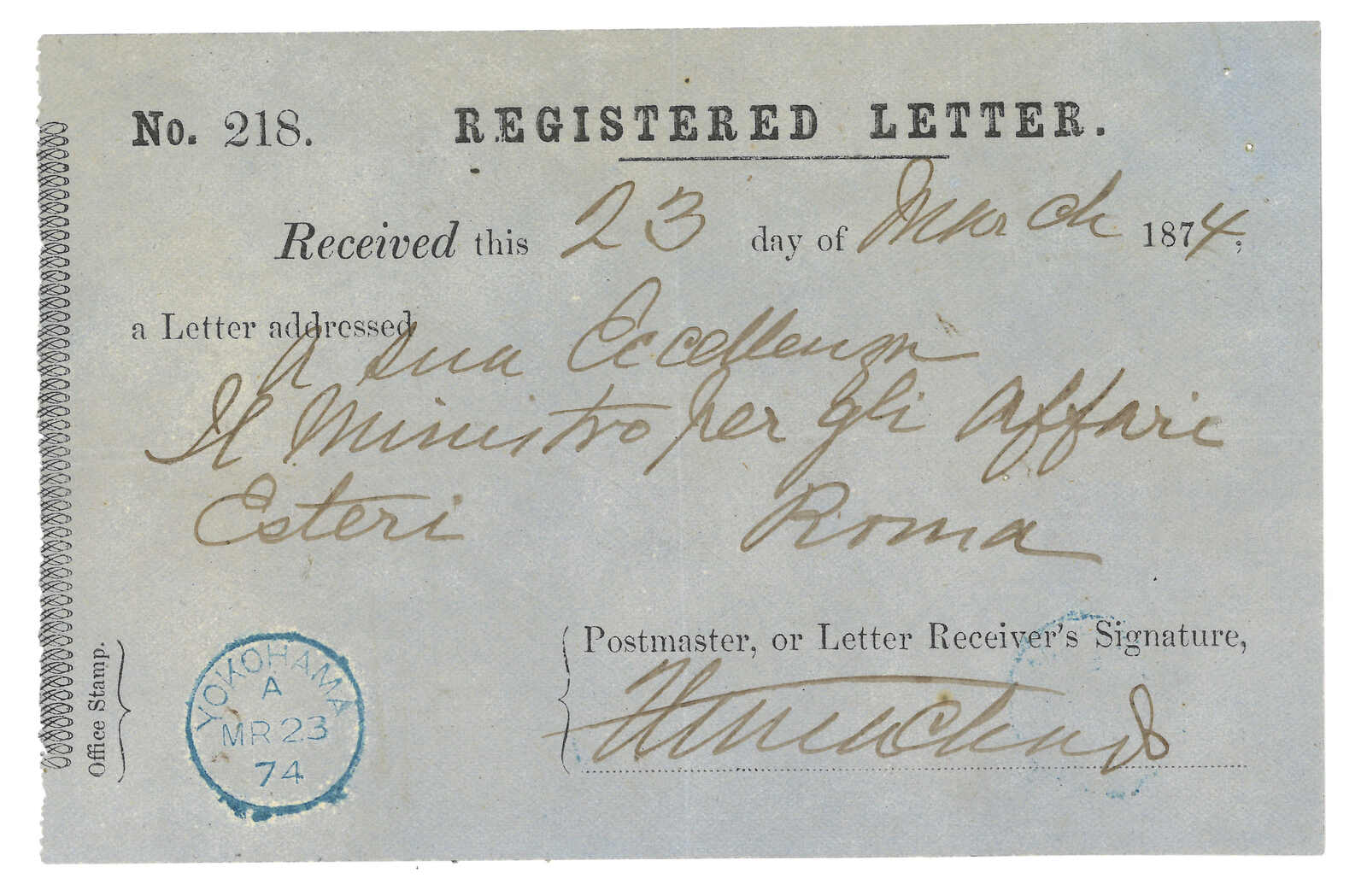 2534 cover image1874 a receipt of registered letter from Yokohama to Italian minister of Foreign Affairs, Rome, applied with Yokohama BPO (23 Mar) cds in violet. With postmaster's signature. Scarce and interesting.