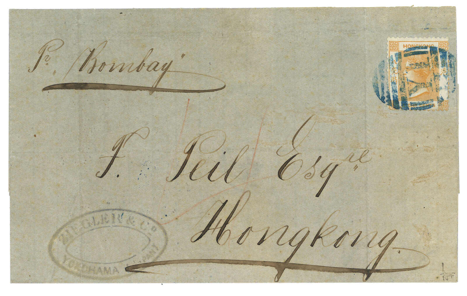 2531 cover image1873 Yokohama (29 Apr) to Hong Kong. Entire letter, f.w. Hong Kong QV 8c, tied by Y1 obliterator in violet, alongside with oval "Ziegler & Co Yokohama" seal. On reverse with Yokohama BPO origin cds. Showing "Pr Bombay" annotation. Arrived Hong Kong (6 May).